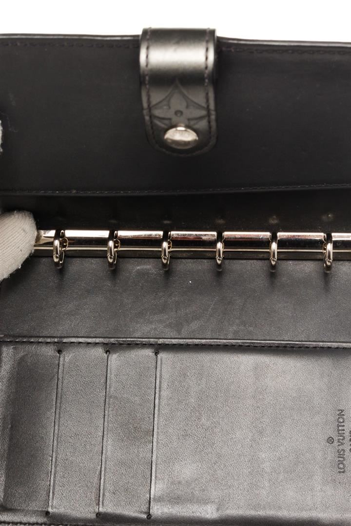 Louis Vuitton Black Monogram Canvas Agenda PM Wallet with monogram canvas, with gold-tone hardware, trim tan vachetta, leather leather lining, interior three compartments pocket and snap closure.