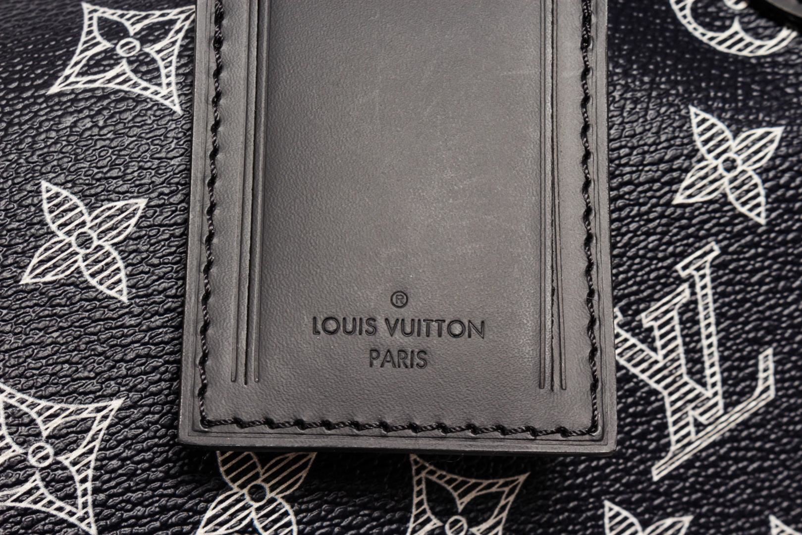 Mens midnight and white Monogram coated canvas Louis Vuitton Upside Down Keepall Bandouliere ekender with multitonal hardware, dual rolled top handles, single flat adjustable canvas shoulder strap, tonal leather trim, inverted Initiales print at front, to