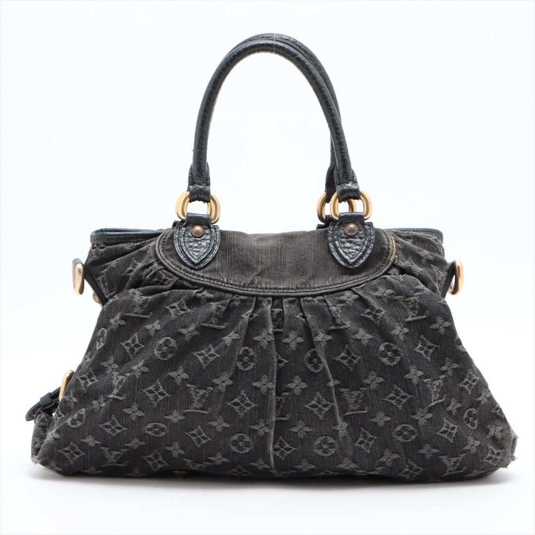 One Louis Vuitton Black Monogram Denim Neo Cabby MM Shoulder Bag. Item is sold AS-IS. All available information is listed in the description and shown in the photo. Black Monogram denim of Louis Vuitton Neo Cabby MM Shoulder Bag with gold-tone hardware, black leather trim, two rolled handles with one detachable shoulder strap, marigold Alcantara lining with dual interior pockets and zip closure at top. Height: 10.5" Width: 15" Depth: 5" Shoulder Strap Drop: 9.5" Handle Drop: 5"