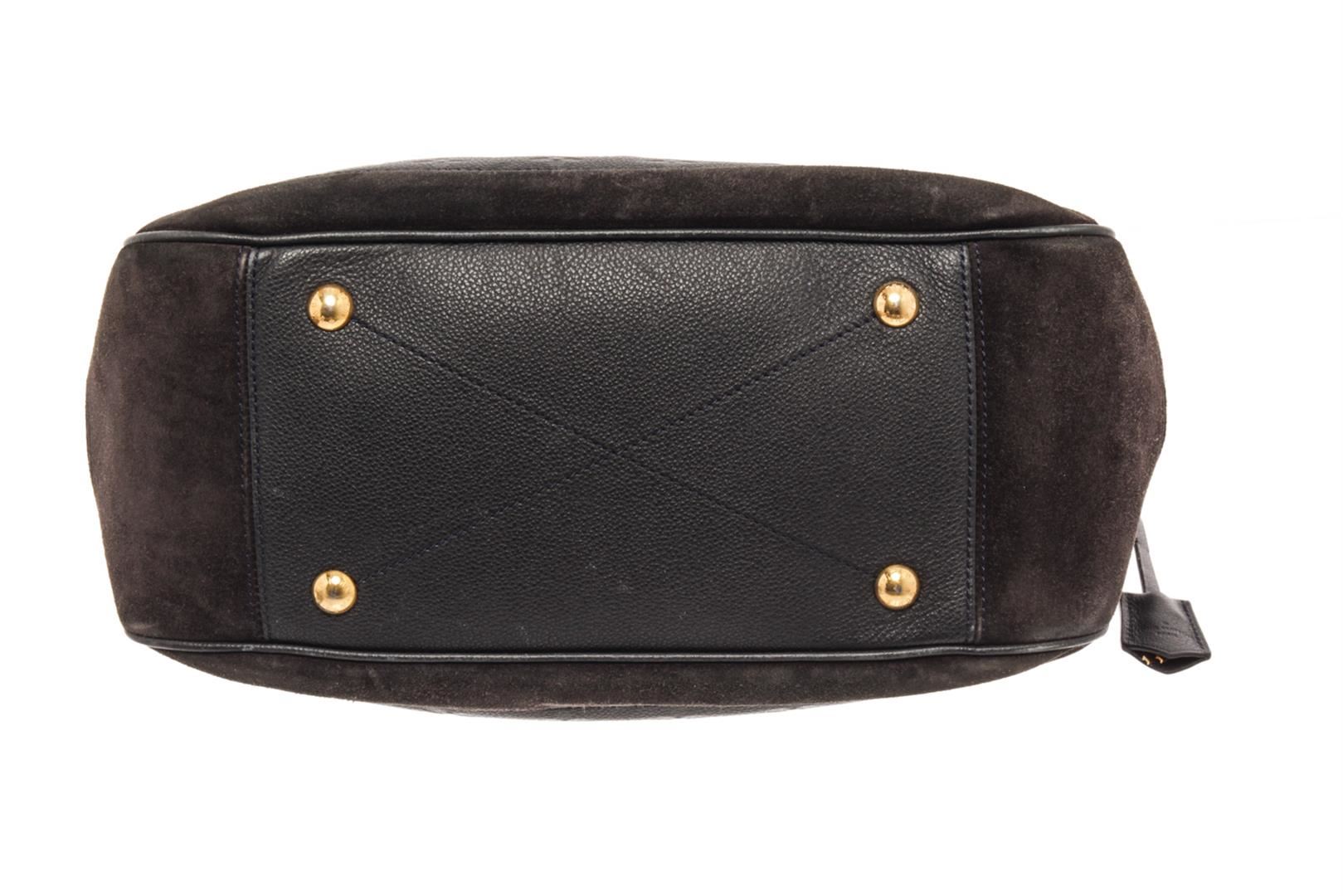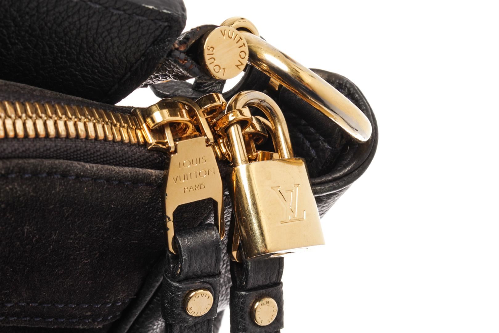 Louis Vuitton Black Monogram Empreinte Leather & Suede Odesius Shoulder Bag. All available information is listed in the description and shown in the photos. Louis Vuitton Black Monogram Empreinte Leather & Suede Shoulder Bag with trim of black suede, a looping leather shoulder strap, a longer *optional* shoulder strap and polished brass hardware. The top zipper opens to a striped blue fabric interior. Height: 11.82 in (30 cm), Width: 13.39 in (34 cm), Depth: 5.91 in (15 cm)