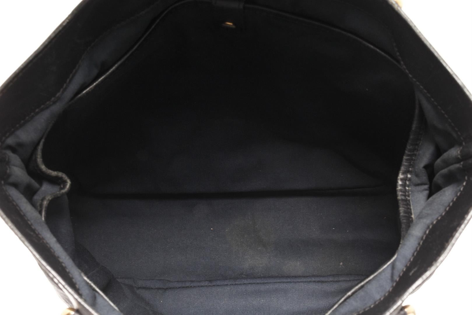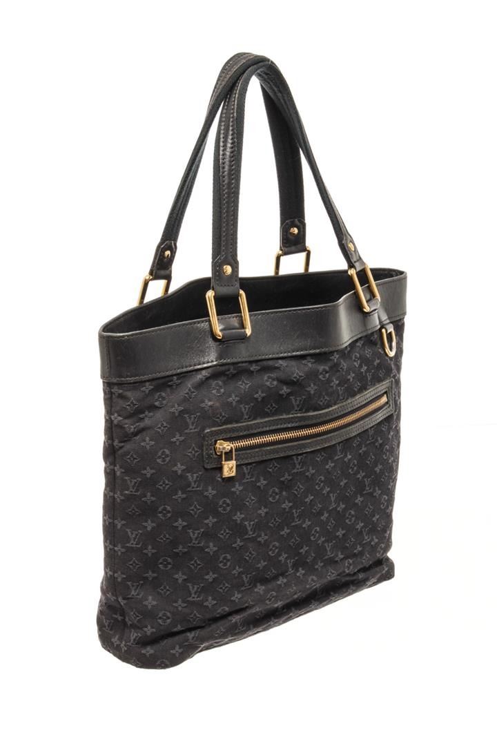 One Louis Vuitton Black Monogram Lucille GM Shoulder Bag. Item is sold AS-IS. All available information is listed in the description and shown in the photo. louis vuitton black monogram lucille gm shoulder bag with leather top handles and leather trim with a frontal zipper pocket and polished brass hardware. the top is open to a fabric interior. Length: 14.00 in, Width: 5.00 in, Height: 12.00 in / 35.56 X 12.7 X 30.48 cm