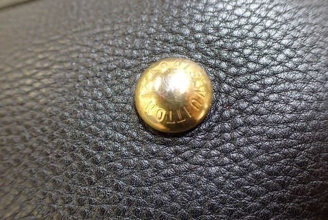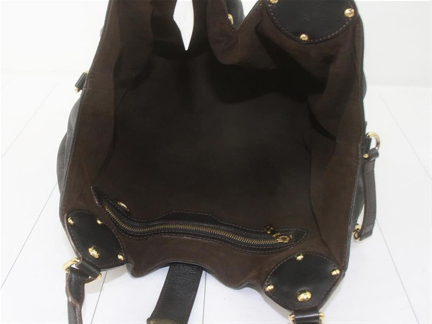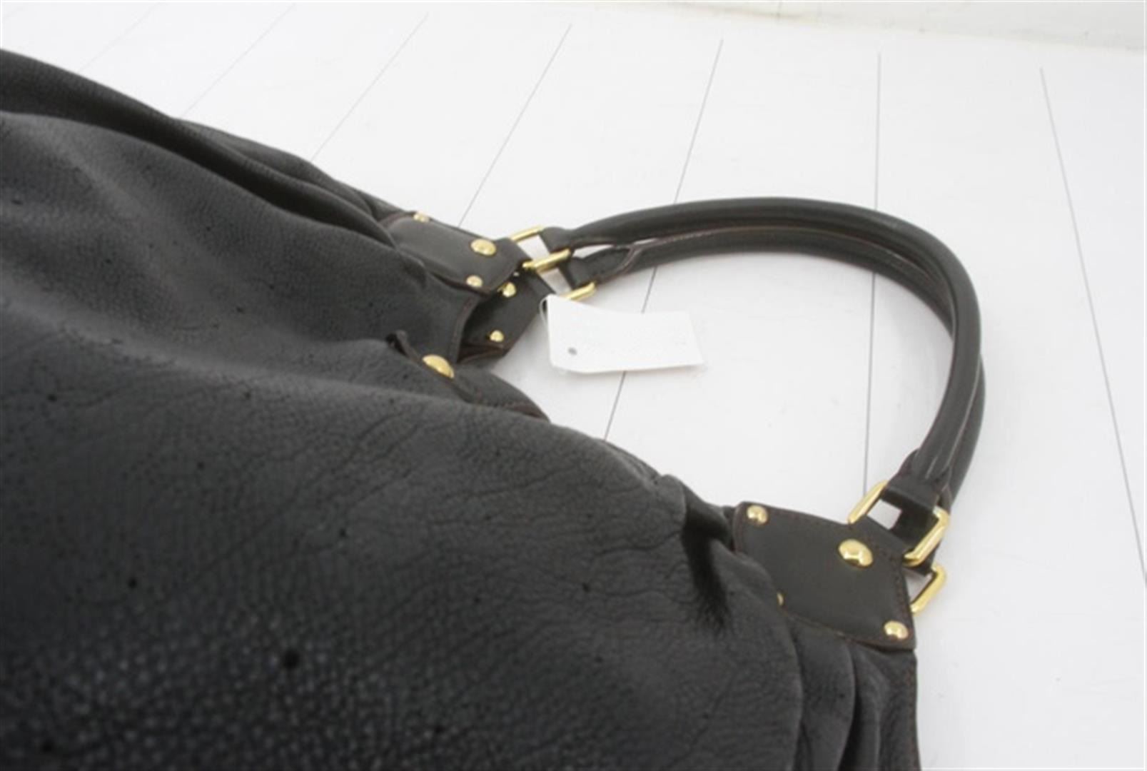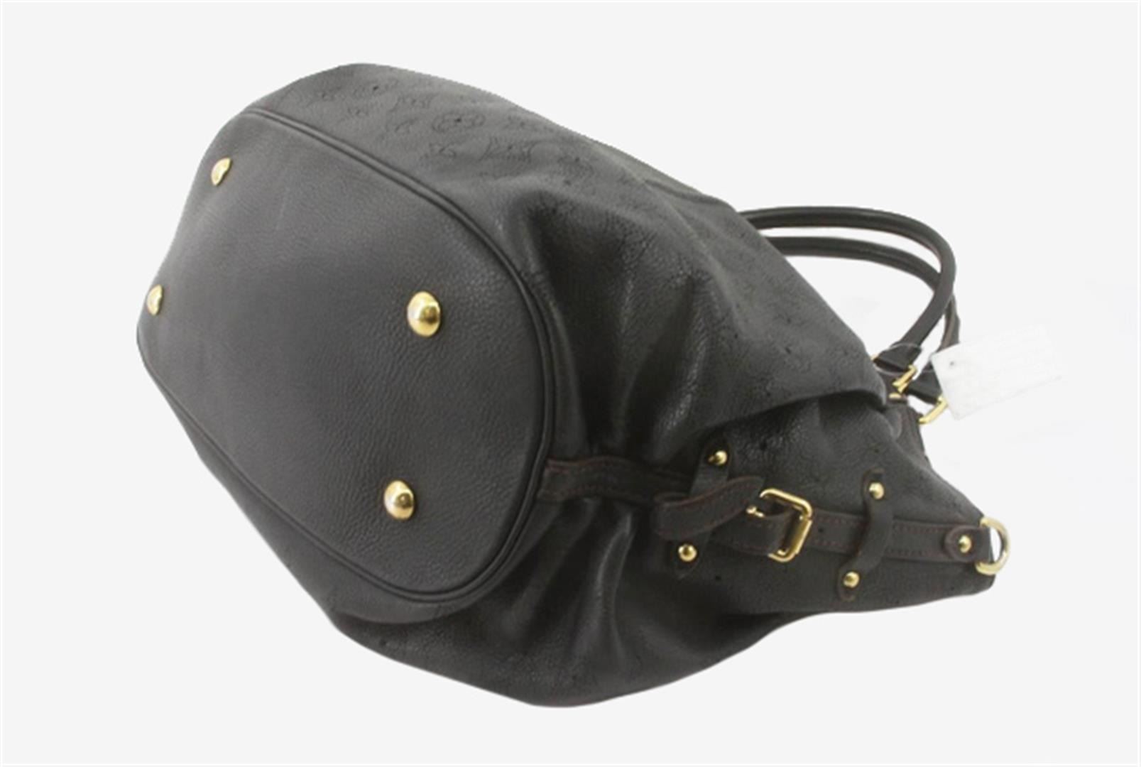 Black perforated monogram Mahina leather Louis Vuitton XL hobo bog with calfskin leather, brown Alcantara interior lining, one zip pocket, double rolled leather handles, open top with leather flap tab and push-lock closure, gold-tone hardware. 15.5" at