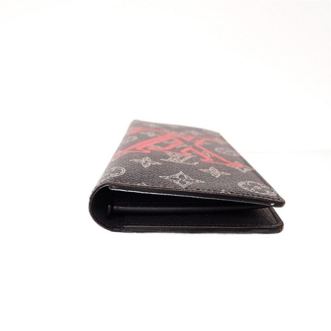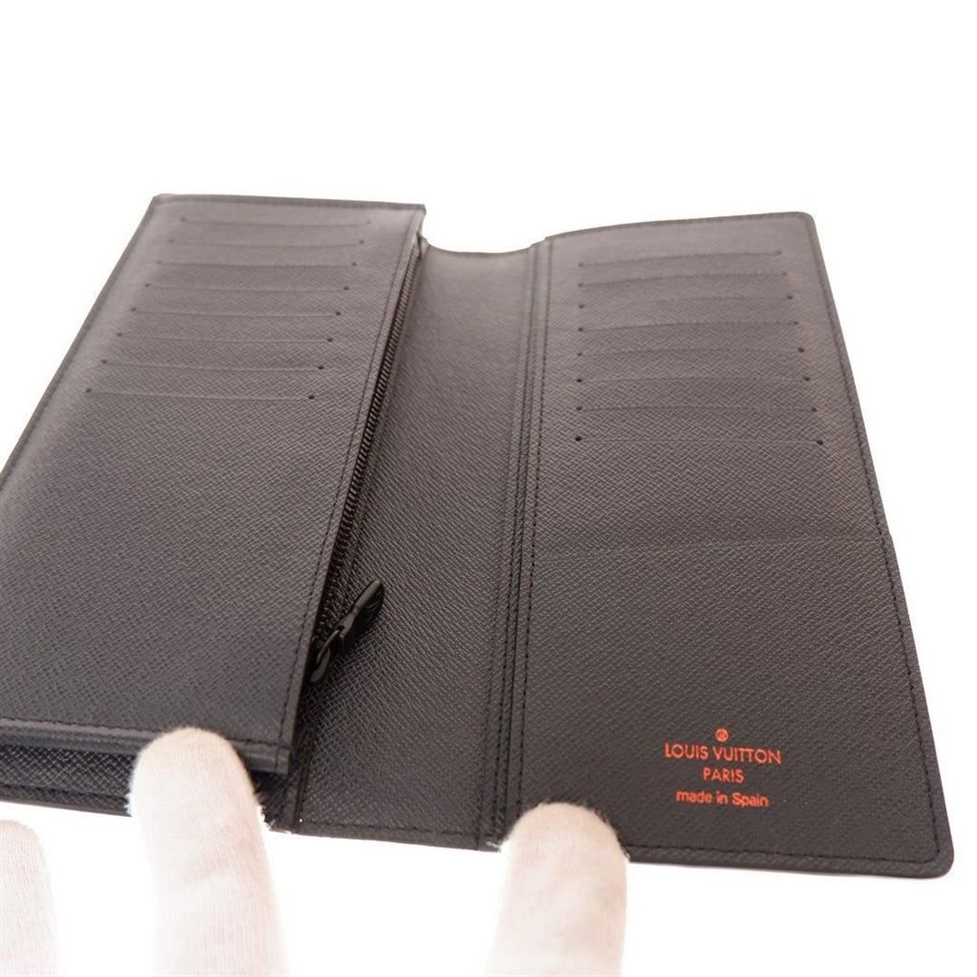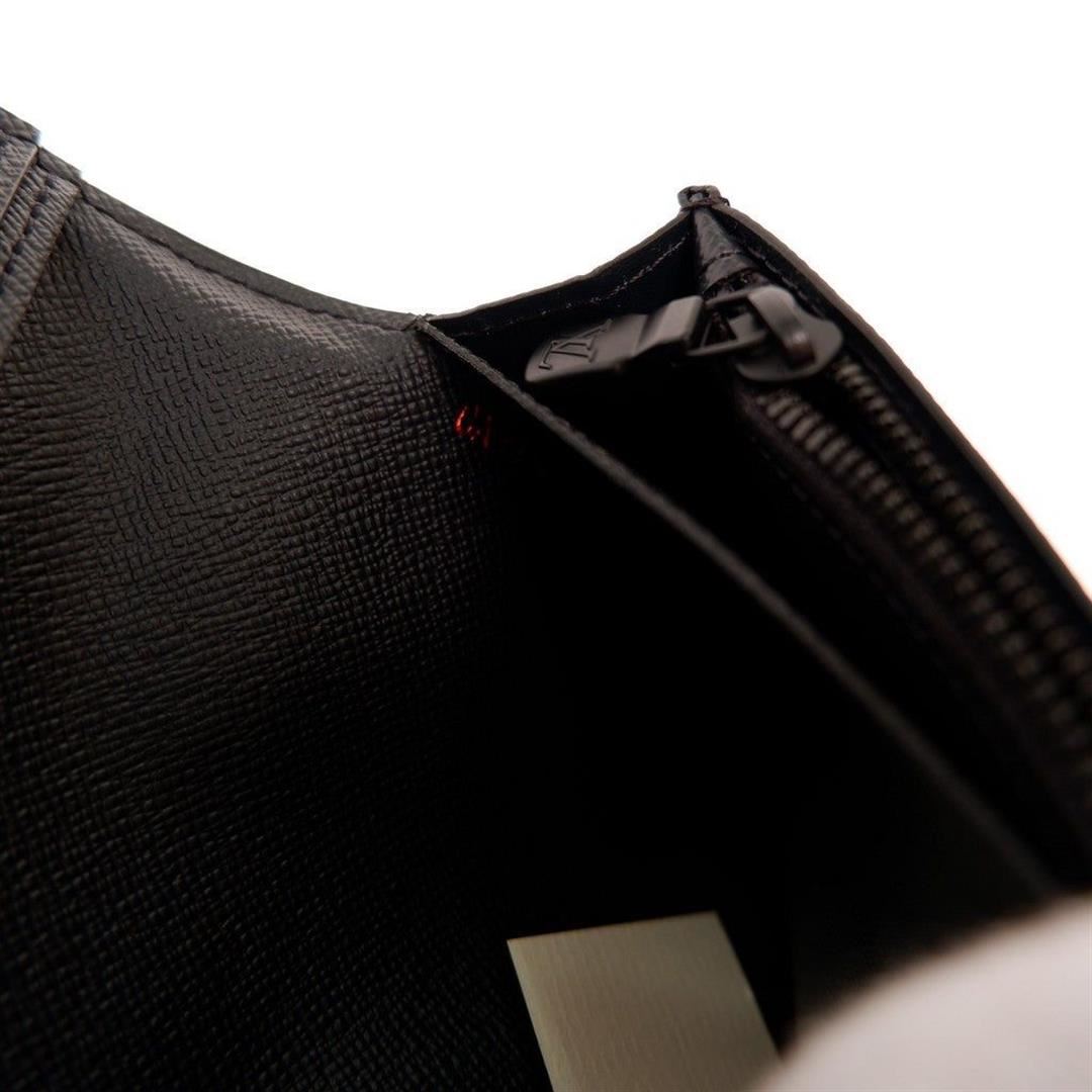 Black monogram canvas Louis Vuitton double flap wallet with the iconic red LV logo features eight card slots, one zip coin pocket, three gusseted pockets, three flat pockets.