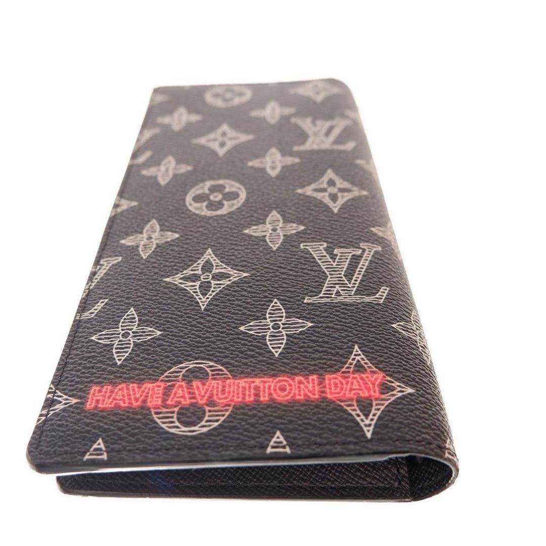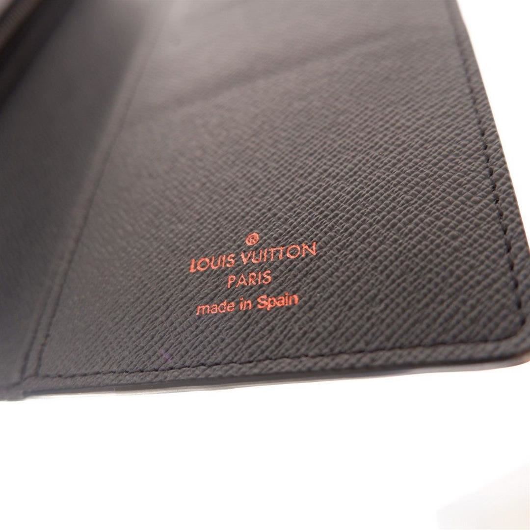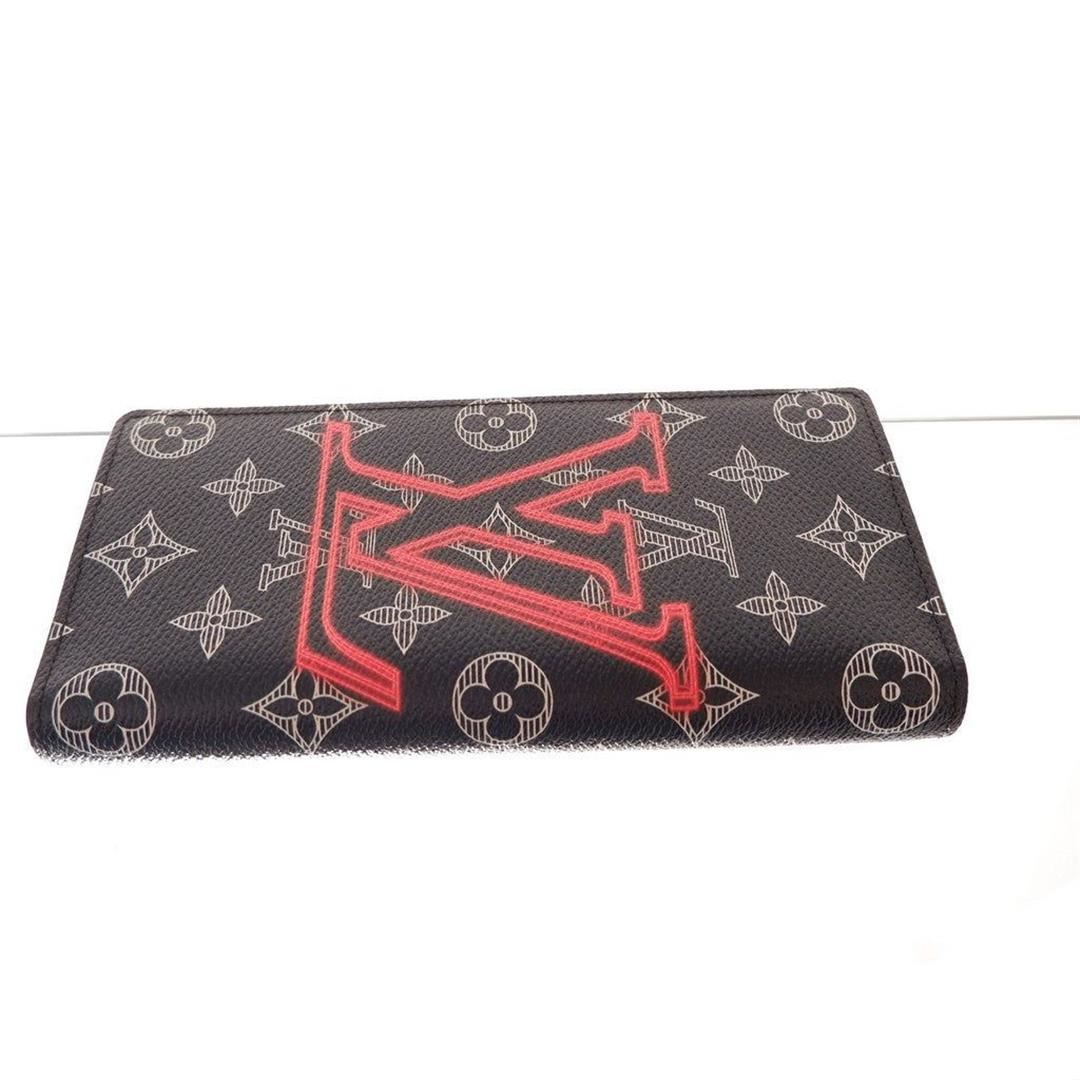 Black monogram canvas Louis Vuitton double flap wallet with the iconic red LV logo features eight card slots, one zip coin pocket, three gusseted pockets, three flat pockets.