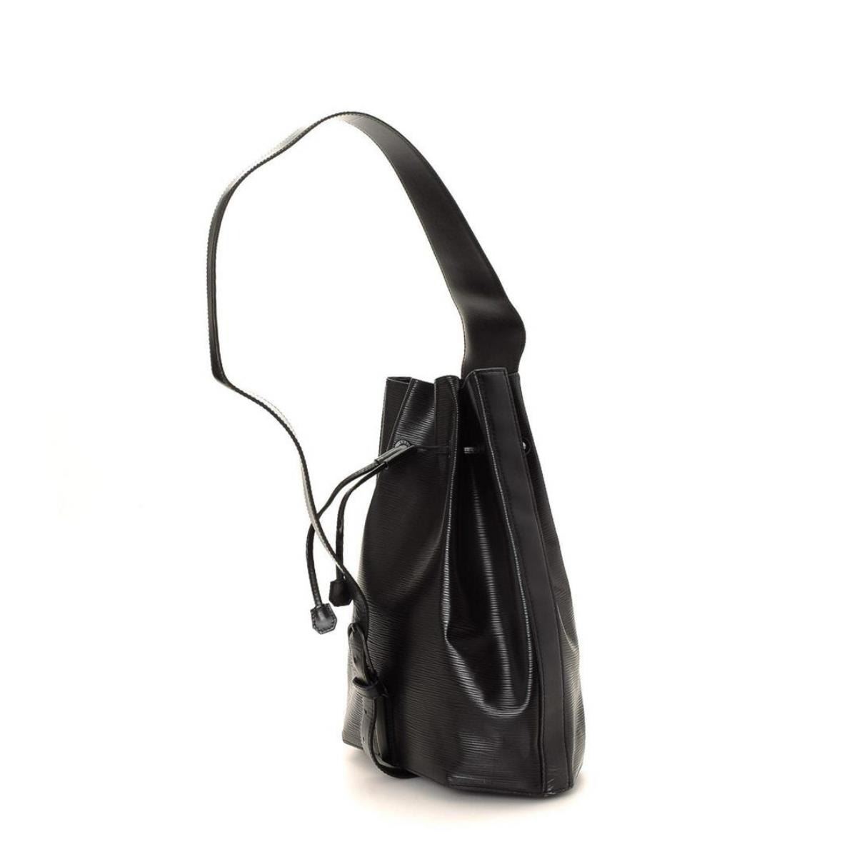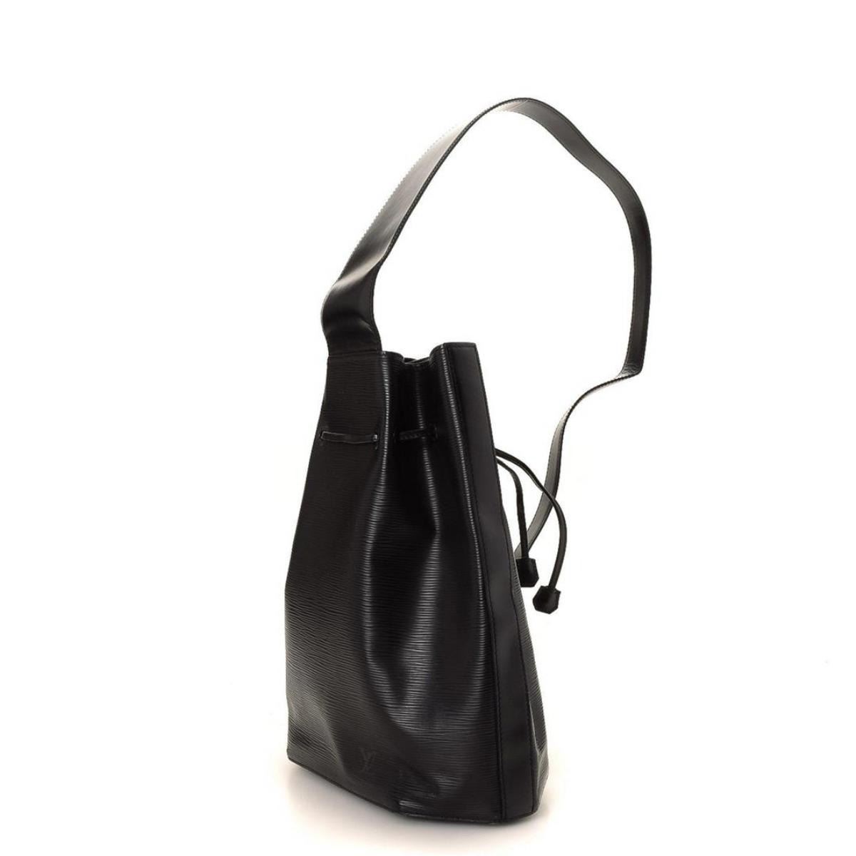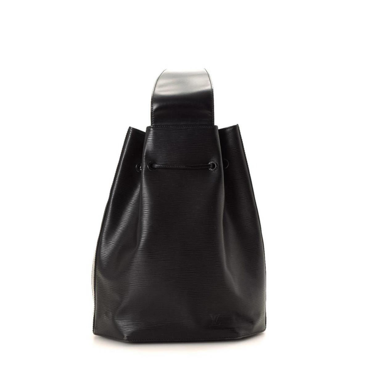Louis Vuitton Black Sac a Dos Shoulder Bag with gold-tone hardware, trim tan vachetta leather, adjustable shoulder strap and drawstring closure.