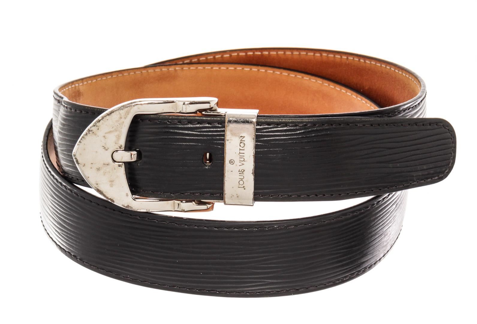 One Louis Vuitton Black Silver Epi Leather Belt. Item is sold AS-IS. All available information is listed in the description and shown in the photo. Louis Vuitton Black Silver Epi Leather Belt with leather, tan vachetta leather, turn lock closure.