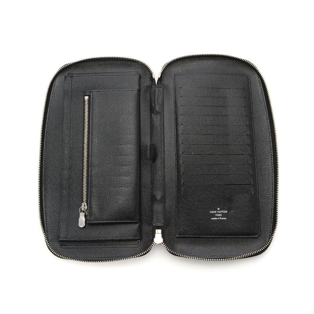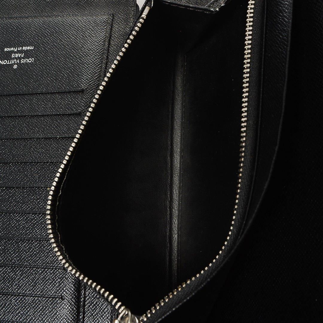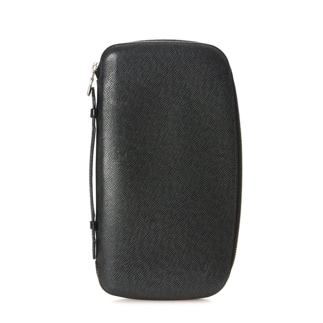 Louis Vuitton Black Taiga Atoll Wallet with gold-tone hardware, trim tan vachetta leather, interior three compartments pocket and zipper closure. Measurements: Length: 1 in / 3 cm Width: 5.75 in / 15 cm 10.5 in / 27 cm Condition: Pre-Owned Good overall, please see photographs for detail.