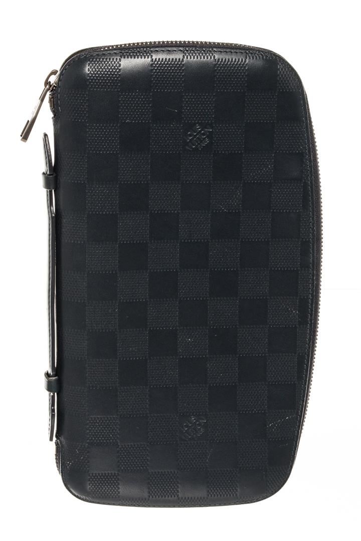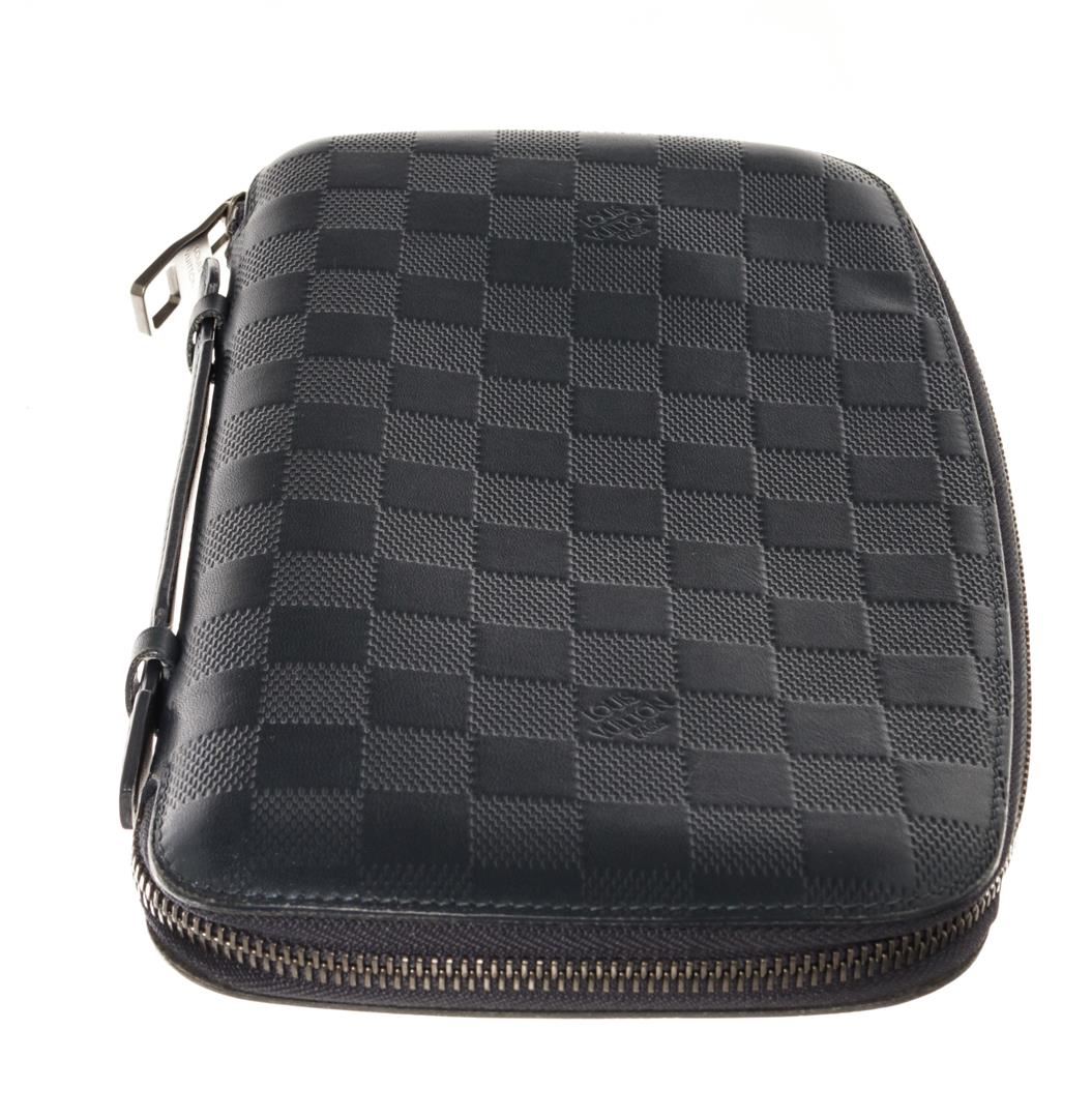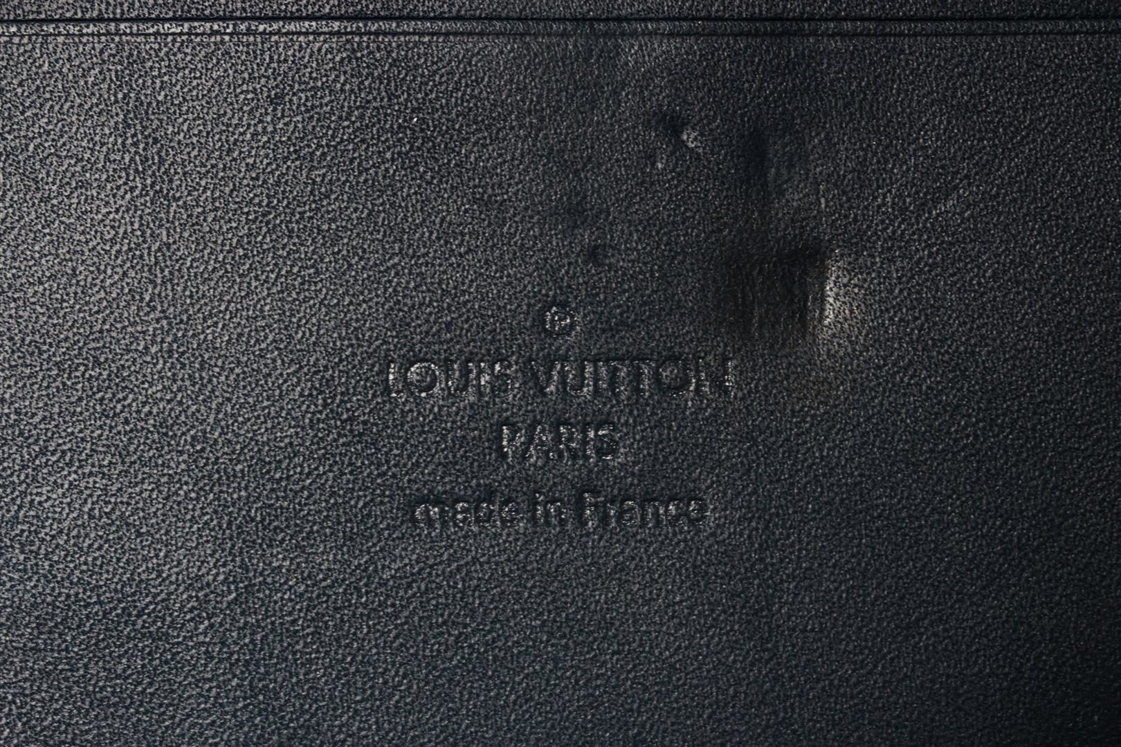 Louis Vuitton Black Taiga Leather Atoll Organizer Clutch. All available information is listed in the description and shown in the photos. Louis Vuitton Black Atoll Organizer Clutch. This organizer has a distinctive compact shape and is crafted of grained leather in black. The case has a leather side handle and a 3/4 wrap around silver zipper that opens to a matching leather interior with pockets, card slots, and a zipper compartment.