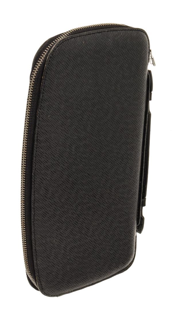 One Louis Vuitton Black Taiga Leather Atoll Organizer Wallet. Item is sold AS-IS. All available information is listed in the description and shown in the photo. Louis Vuitton Black Taiga Leather Atoll Organizer Wallet with silver tone hardware, black leather trim, black leather lining, interior zip pocket, open slot pockets, and zipper closure.