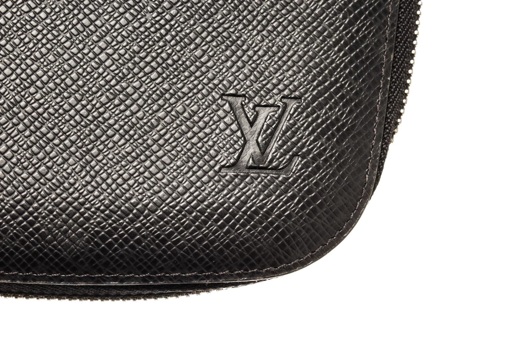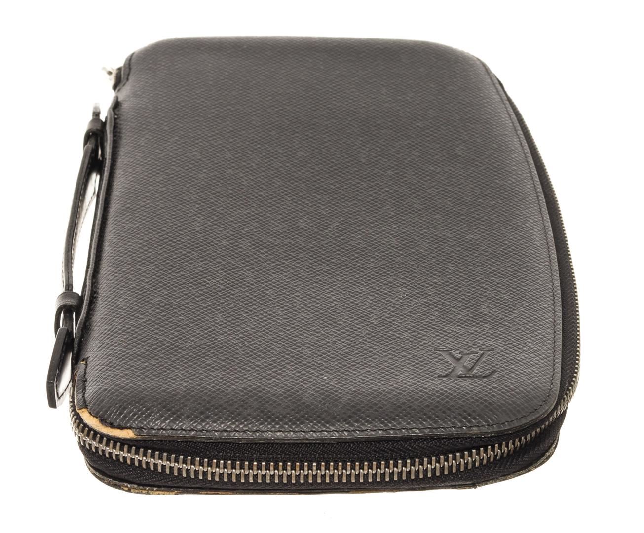 One Louis Vuitton Black Taiga Leather Atoll Organizer Wallet. Item is sold AS-IS. All available information is listed in the description and shown in the photo. Louis Vuitton Black Taiga Leather Atoll Organizer Wallet with silver tone hardware, black leather trim, black leather lining, interior zip pocket, open slot pockets, and zipper closure.