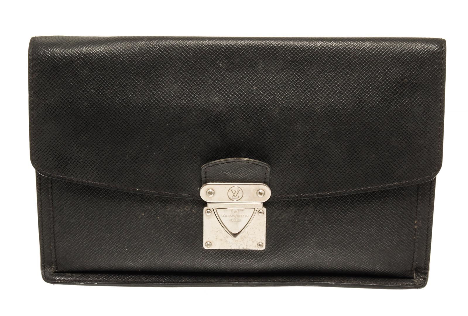 One Louis Vuitton Black Taiga Leather Belaia Clutch. Item is sold AS-IS. All available information is listed in the description and shown in the photo. Louis Vuitton Black Taiga Leather Belaia Clutch with silver-tone hardware, black canvas lining, interior slip and zip pockets, detachable wrist strap, and flap closure with push lock. 75621.
