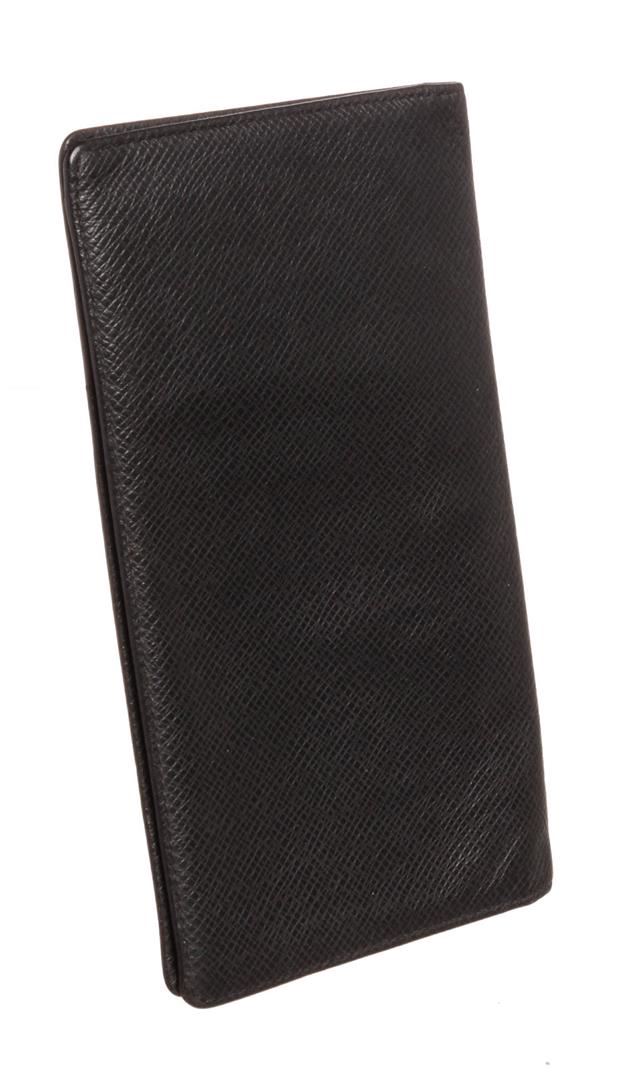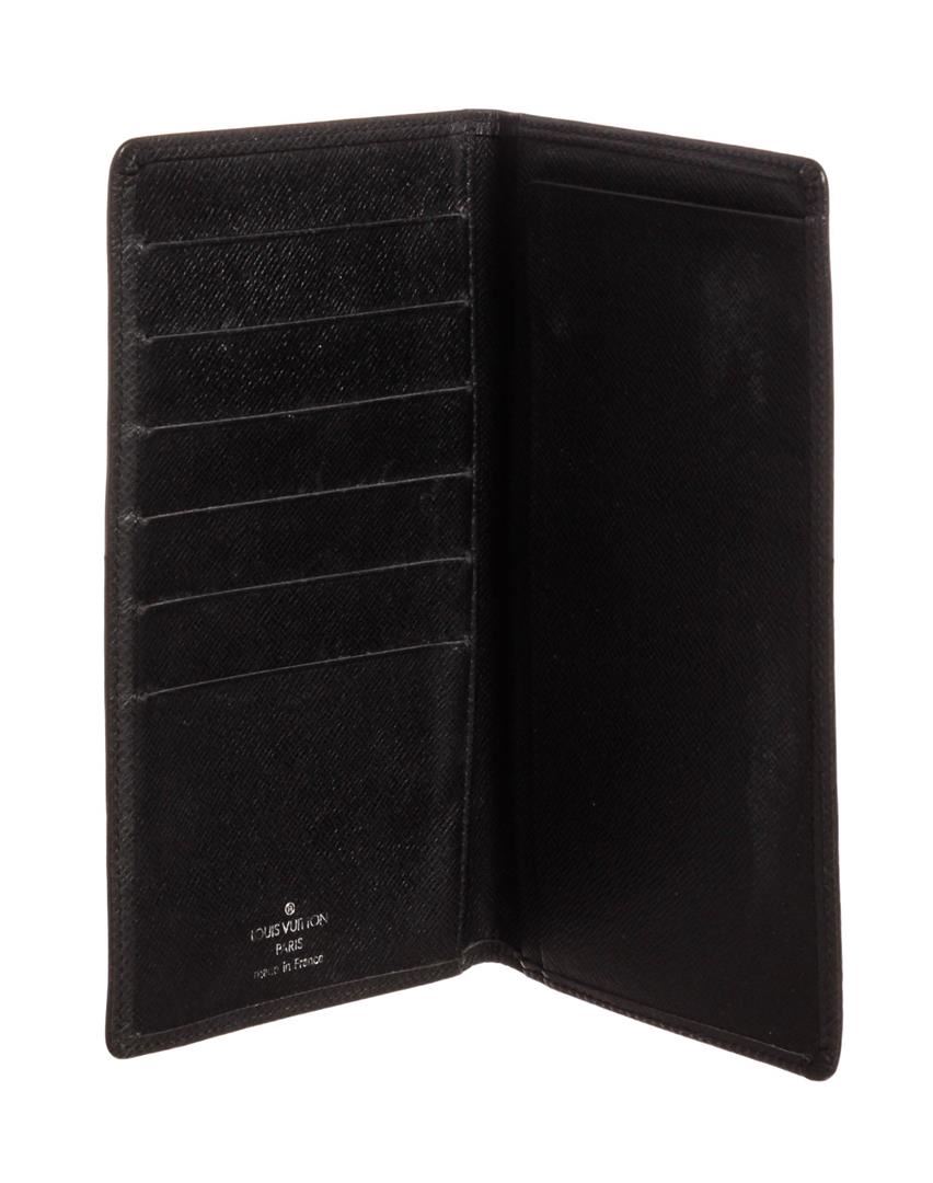 Black taiga leather Louis Vuitton checkbook wallet with tonal leather lining, six card slots, two side slip pockets, and an open side.