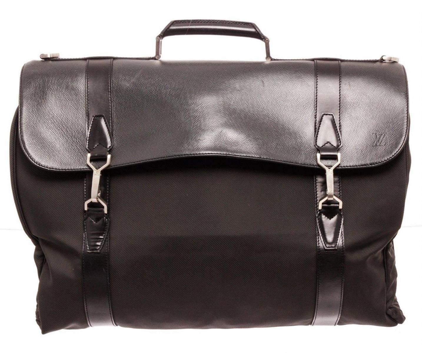 Louis Vuitton Black Taiga Leather Garment Bag with silver-tone hardware, black Taiga leather trim throughout exterior, single flat adjustable shoulder strap with script logo throughout, single rolled black leather handle at top, debossed Monogram at flap closure, clasp closure at front, four exterior pockets with zip closures at front and back, single rack hook at top interior, single garment compartment with two-way all around zip closure, black tonal interior nylon lining with dual pockets with zip closure. Measurements: Length: 1.75 in / 4 cm Width: 22.25 in / 57 cm 37.5 in / 95 cmCONDITION: Pre-Owned Good overall, please see photographs for detail.