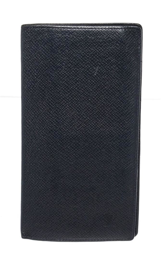 Louis Vuitton Black Taiga Leather Long Bifold Wallet with taiga leather, silver-tone hardware, debossed logo at front face, black, interior lining, three slit pockets, six card slots and overall bifold closure.
