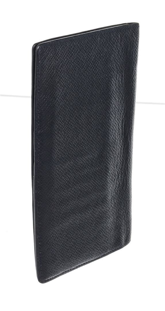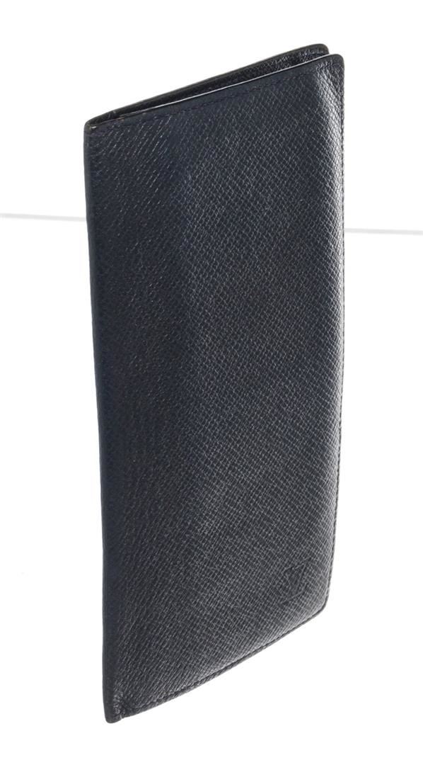 One Louis Vuitton Black Taiga Leather Long Bifold Wallet. Item is sold AS-IS. All available information is listed in the description and shown in the photo. Louis Vuitton Black Taiga Leather Long Bifold Wallet with taiga leather, silver-tone hardware, debossed logo at front face, black, interior lining, three slit pockets, six card slots and overall bifold closure.