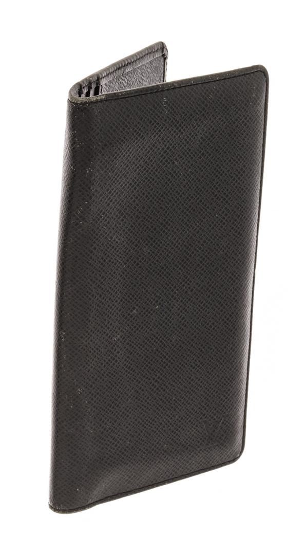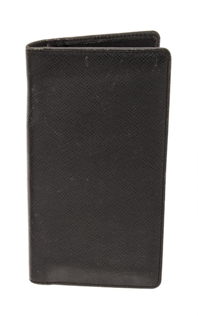 Louis Vuitton Black Taiga Leather Portefeuille Brazza Wallet. All available information is listed in the description and shown in the photos. louis vuitton black taiga leather portefeuille brazza wallet with black leather, interior pockets with card slots, silver tone hardware, trim tan vachetta leather, leather lining, flap closure.