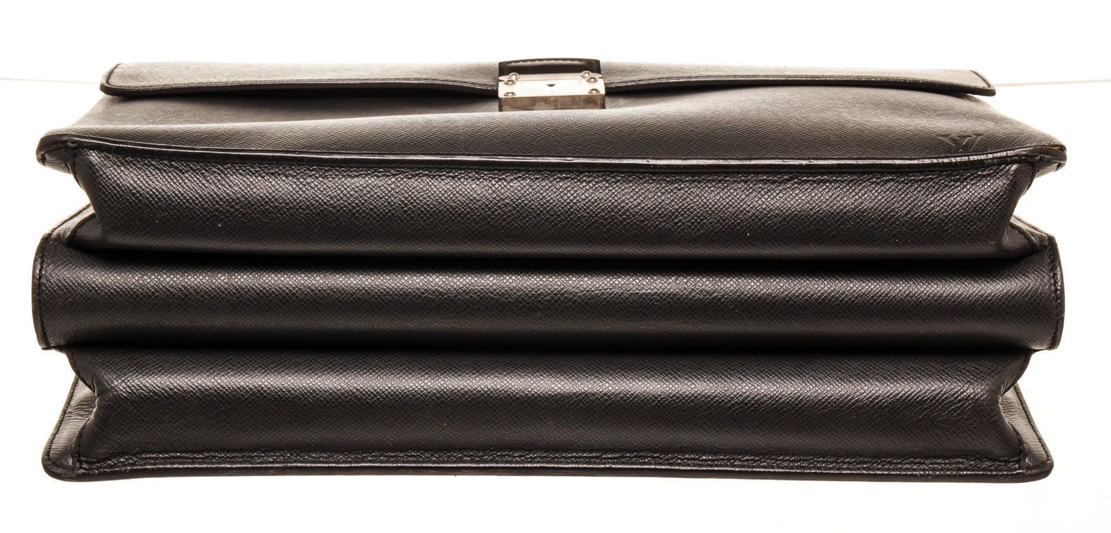 Louis Vuitton Black Taiga Leather Robusto 3 Briefcase Bag with taiga leather, silver-tone hardware, single rolled top handle, embossed logo accent at front corner, back exterior slit pocket, grey tonal canvas lining, three interior compartments; one with