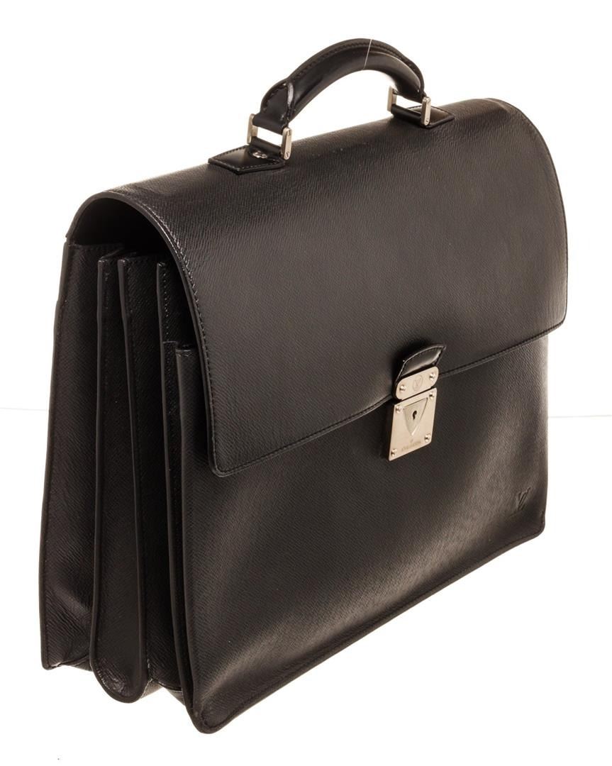 One Louis Vuitton Black Taiga Leather Robusto 3 Briefcase Bag. Item is sold AS-IS. All available information is listed in the description and shown in the photo. Louis Vuitton Black Taiga Leather Robusto 3 Briefcase Bag with taiga leather, silver-tone hardware, single rolled top handle, embossed logo accent at front corner, back exterior slit pocket, grey tonal canvas lining, three interior compartments; one with zip closure.