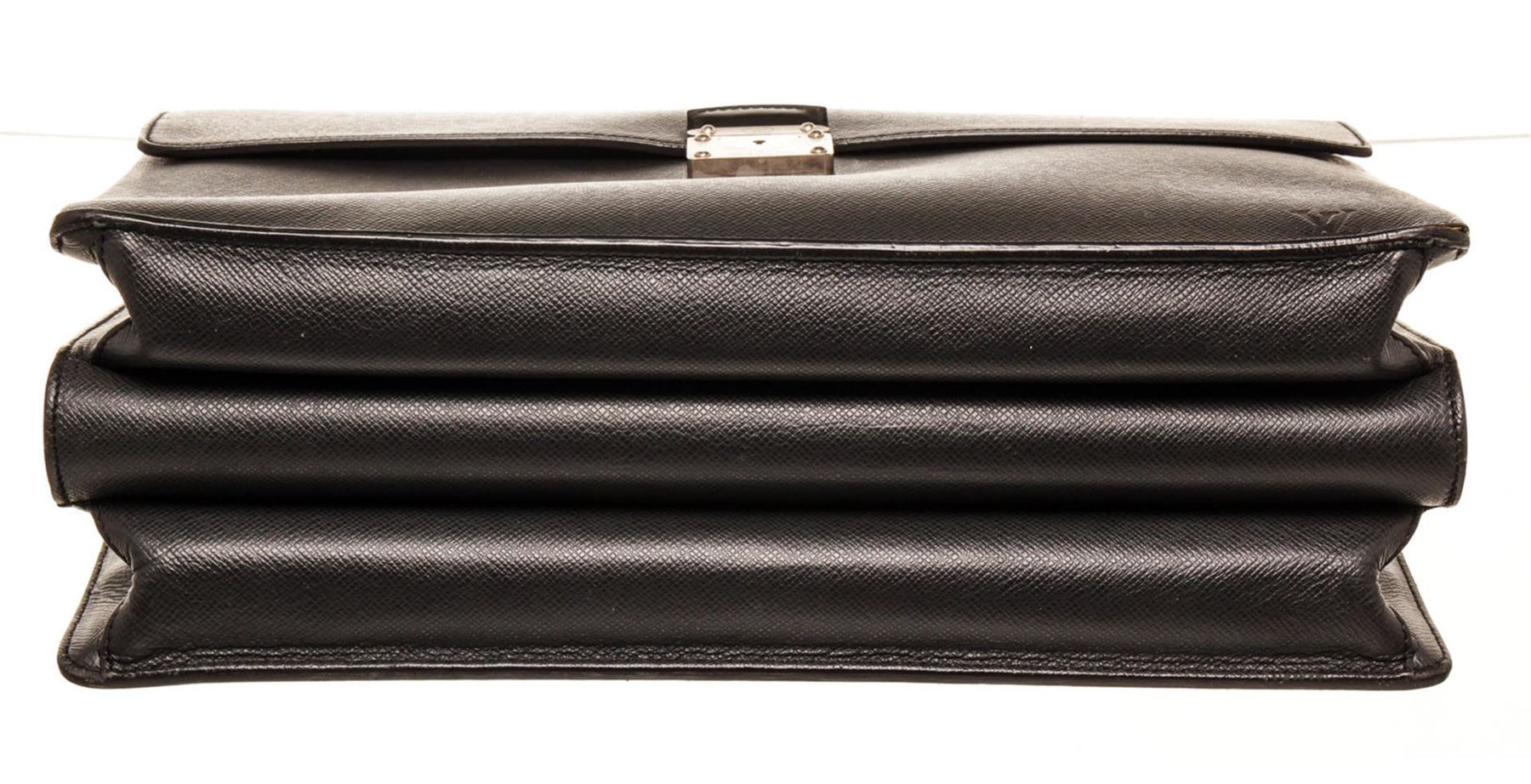 One Louis Vuitton Black Taiga Leather Robusto 3 Briefcase Bag. Item is sold AS-IS. All available information is listed in the description and shown in the photo. Louis Vuitton Black Taiga Leather Robusto 3 Briefcase Bag with taiga leather, silver-tone hardware, single rolled top handle, embossed logo accent at front corner, back exterior slit pocket, grey tonal canvas lining, three interior compartments; one with zip closure.