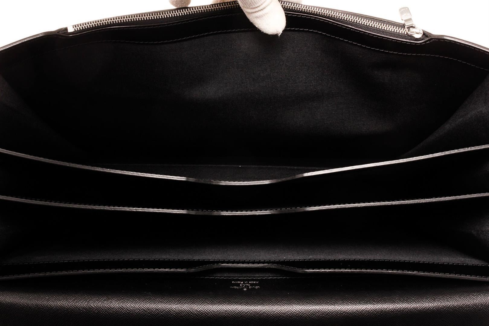 One Louis Vuitton Black Taiga Leather Robusto 3 Briefcase Bag. Item is sold AS-IS. All available information is listed in the description and shown in the photo. Louis Vuitton Black Taiga Leather Robusto 3 Briefcase Bag with taiga leather, silver-tone hardware, single rolled top handle, embossed logo accent at front corner, back exterior slit pocket, grey tonal canvas lining, three interior compartments; one with zip closure.