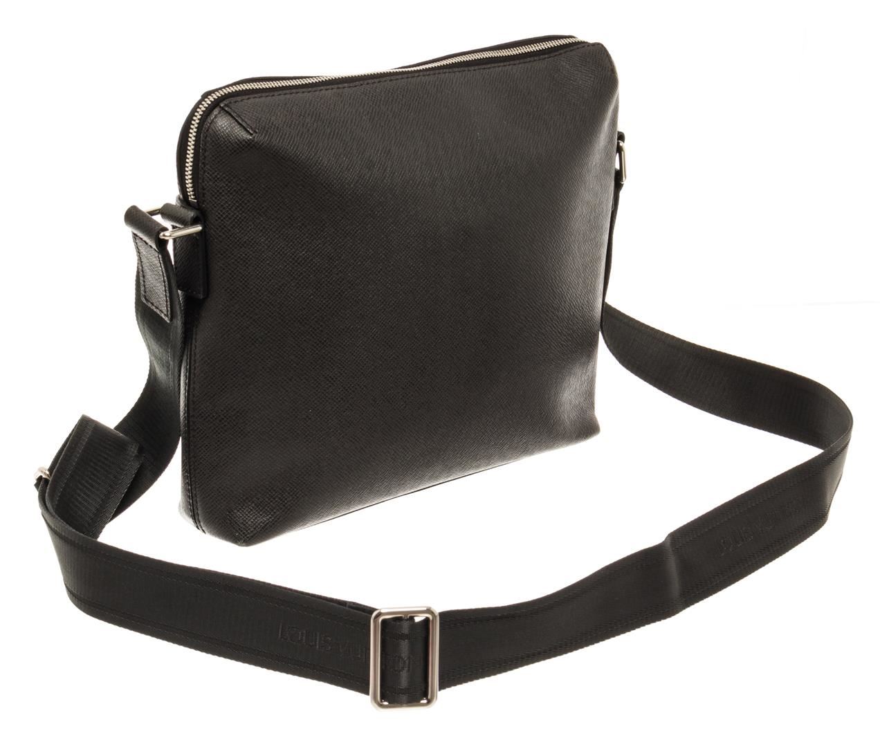 One Louis Vuitton Black Taiga Leather Watcher Messenger Bag. Item is sold AS-IS. All available information is listed in the description and shown in the photo. Louis Vuitton Black Taiga Leather Watcher Messenger Bag with silver tone hardware, black leather trim, black fabric lining, interior open pockets, adjustable strap, and zipper closure.