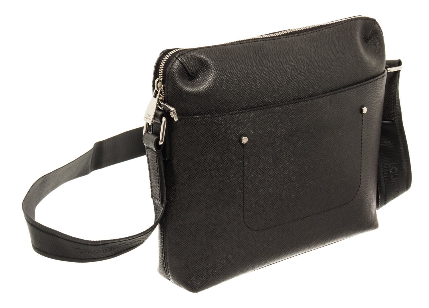 One Louis Vuitton Black Taiga Leather Watcher Messenger Bag. Item is sold AS-IS. All available information is listed in the description and shown in the photo. Louis Vuitton Black Taiga Leather Watcher Messenger Bag with silver tone hardware, black leather trim, black fabric lining, interior open pockets, adjustable strap, and zipper closure.