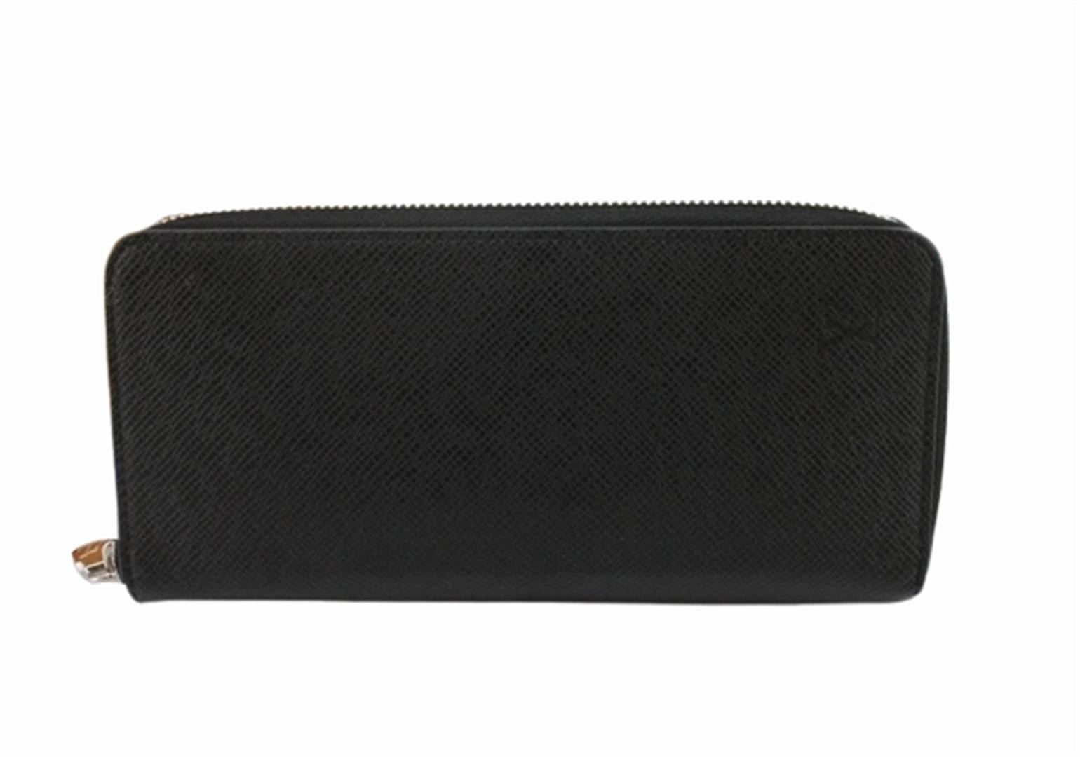 Black Taiga leather Louis Vuitton Zippy Vertical wallet with silver-tone hardware, black leather lining & single interior pocket with card slots and exposed zip closure. Height: 4" Width: 7.75" Depth: 0.75"
