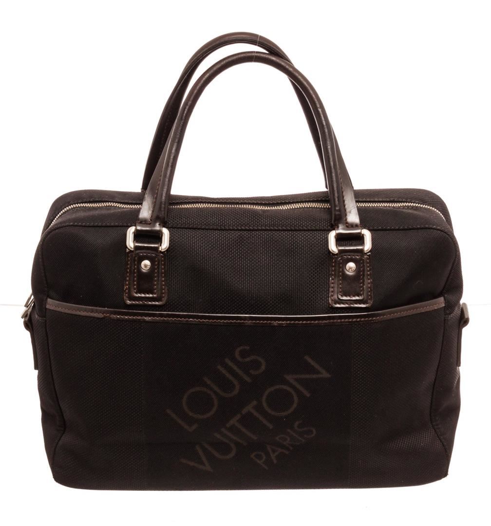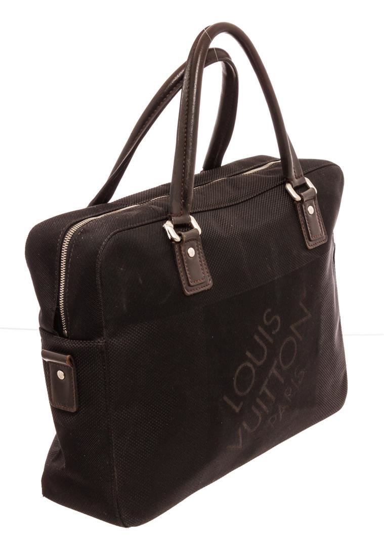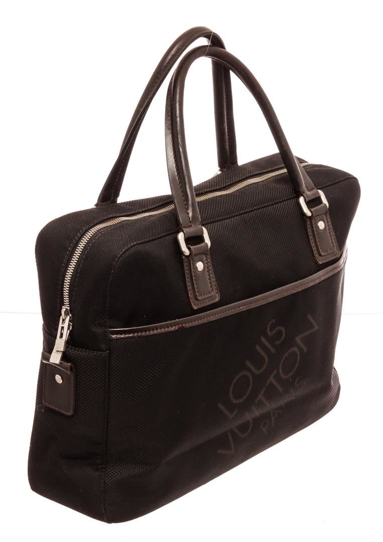 Louis Vuitton Black Yack Briefcases with gold-tone hardware, trim tan vachetta leather, canvas lining, dual top handle and zipper closure.