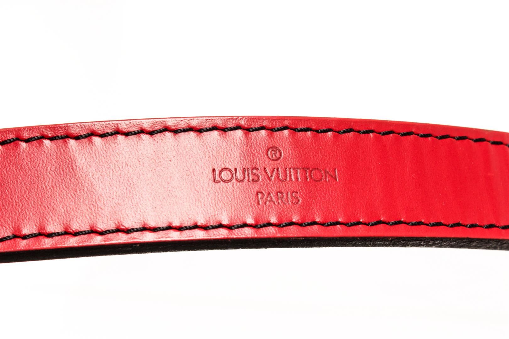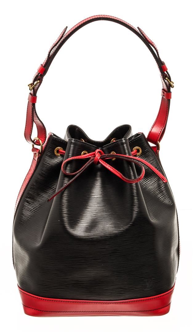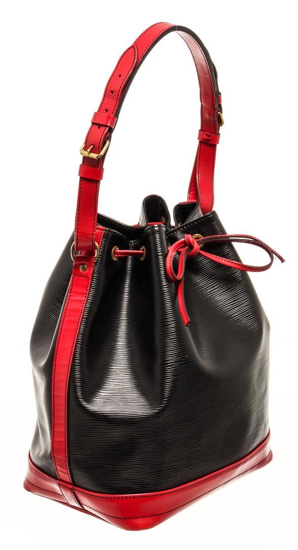 One Louis Vuitton Black and Red Bicolor Epi Leather Noe Shoulder Bag. Item is sold AS-IS. All available information is listed in the description and shown in the photo. Louis Vuitton black and red bicolor epi leather Noe shoulder bag with black suede lining, an adjustable shoulder strap, and a top red leather drawstring closure and interior zipper pocket. Such a great color combination bag from the 90s. The leather on the side strap is peeling as shown in picture. Height: 10.23" Width: 13.38" Depth: 7.08", Shoulder Drop: 20.07" / 26 x 34 x 18 Cm