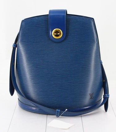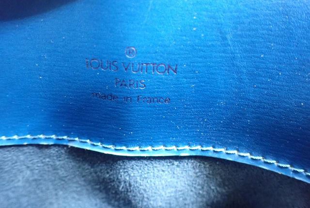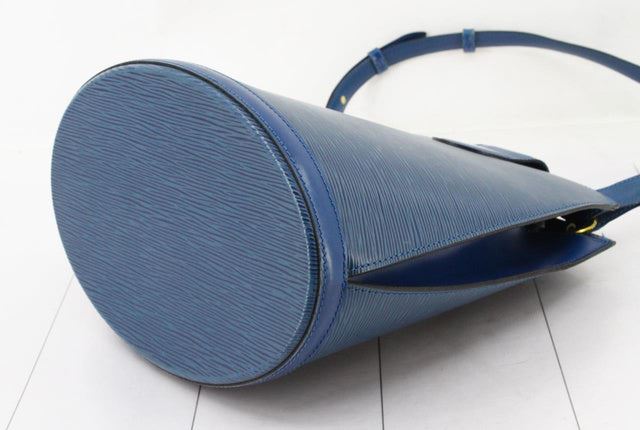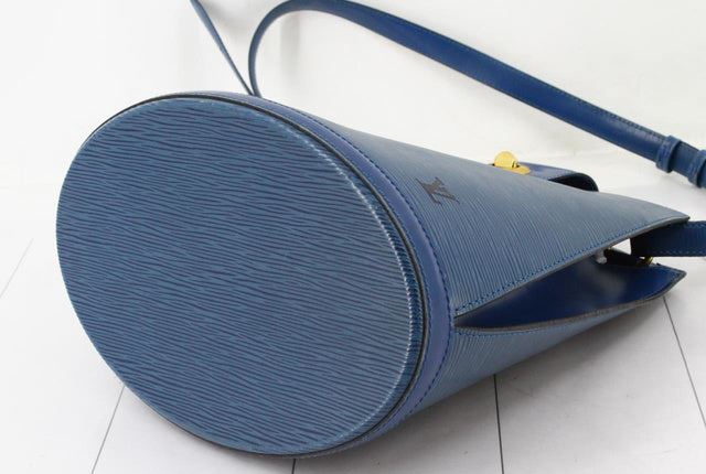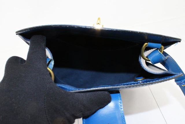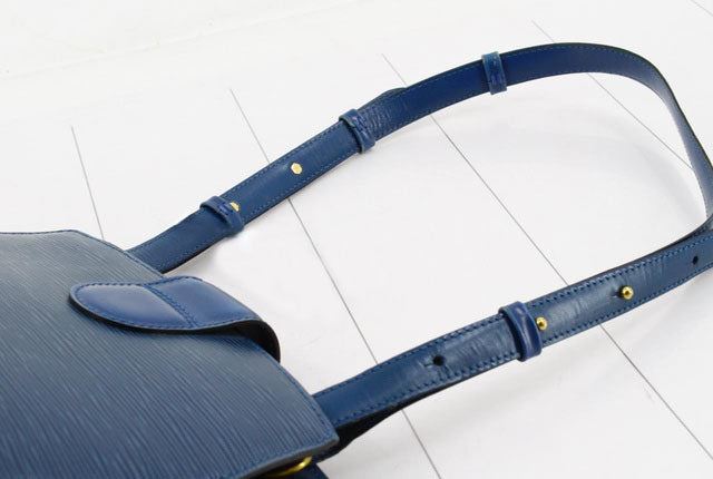 Blue Epi leather Louis Vuitton Cluny shoulder bag with gold-tone hardware, single flat shoulder strap with peg-in-hole adjustment, embossed logo at front corner, blue Alcantara lining, single pocket at interior wall and turn-lock closure at front flap.