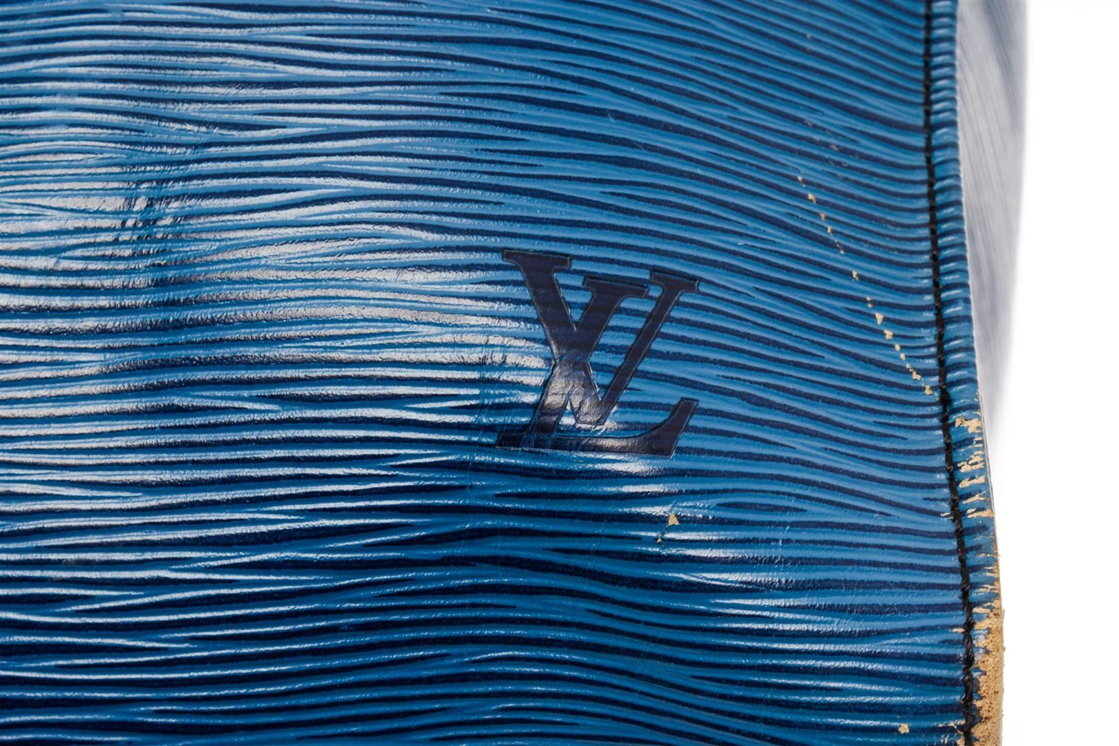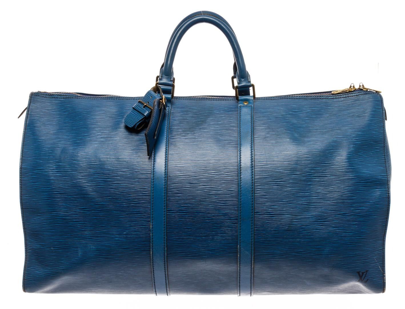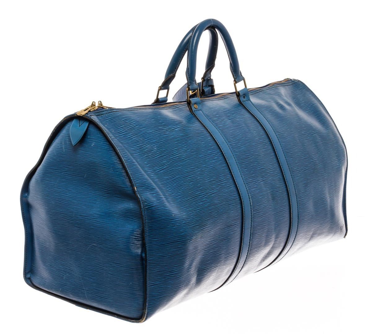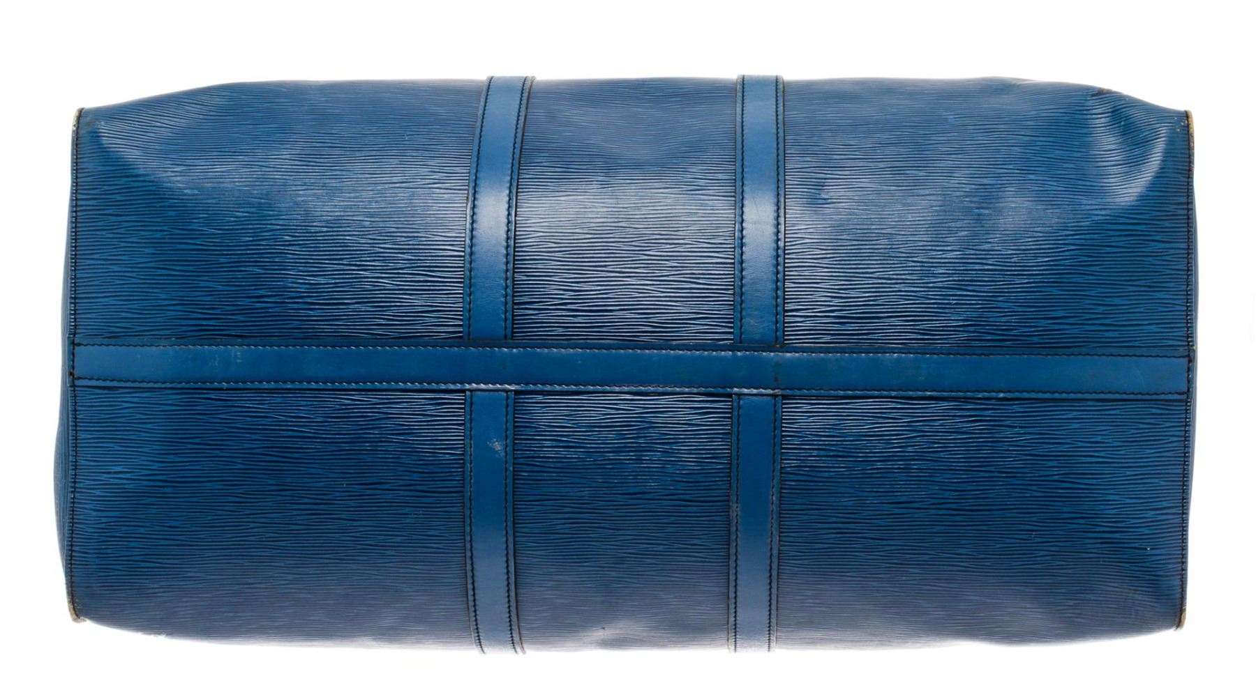 Louis Vuitton Blue Epi Leather Keepall 55 Travel Bag. All available information is listed in the description and shown in the photos. Louis Vuitton Blue Epi Leather Keepall 55 Travel Bag with gold-tone brass hardware, dual rolled top handles, handle holder, suede lining, luggage tag, two-way zip fastening, top zipper closure. Condition Details: Some visible wear/discoloration/scratches along front, sides, handles and bottom corners, slight creasing, scratches on inner alcantara lining. Height: 11.5" Width: 22.25" Depth: 9.5", Handle Drop: 4" / 29.21 x 56.51 x 24.13 cm