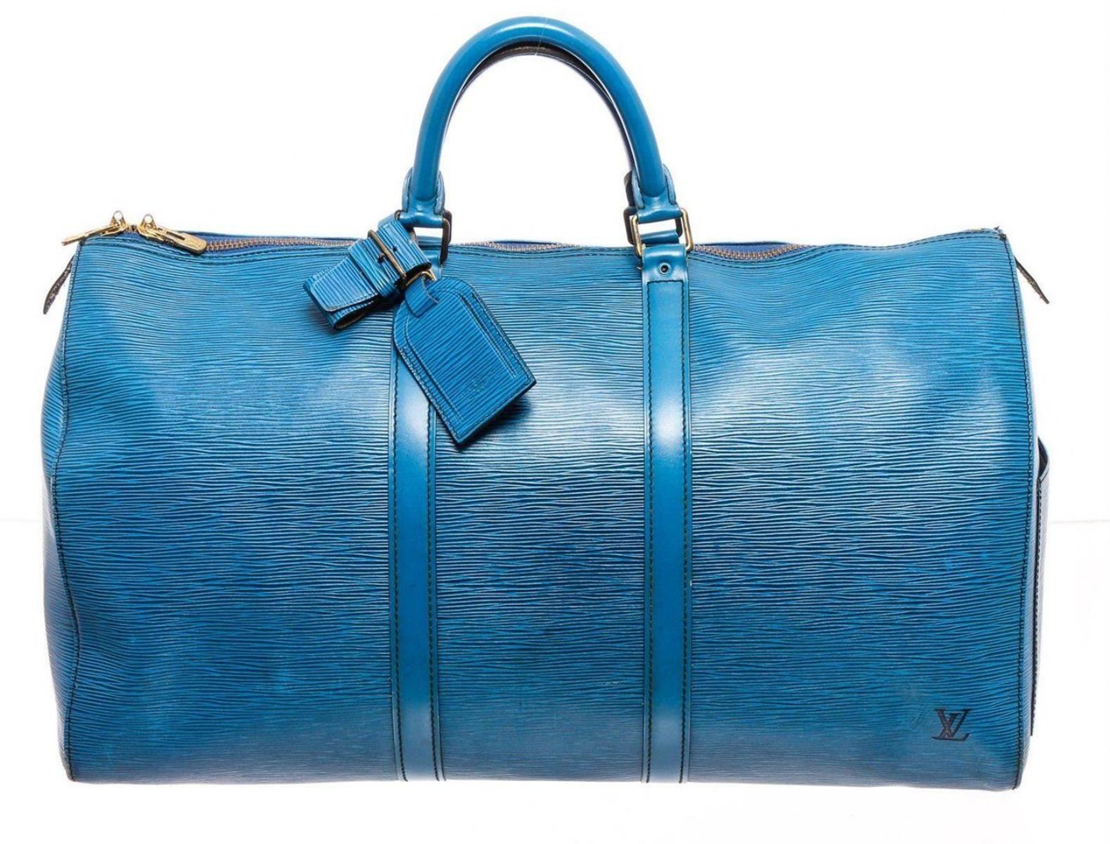 Blue Epi leather Louis Vuitton Keepall 55 with bronze hardware, dual rolled top handles, patch pocket at exterior side, Alcantara lining, single interior compartment and two-way zip closures at top. Measurements: Length: 21 in / 53 cm Width: 10 in / 25 cm 12 in / 30 cmCONDITION: Pre-Owned Good overall, please see photographs for detail.
