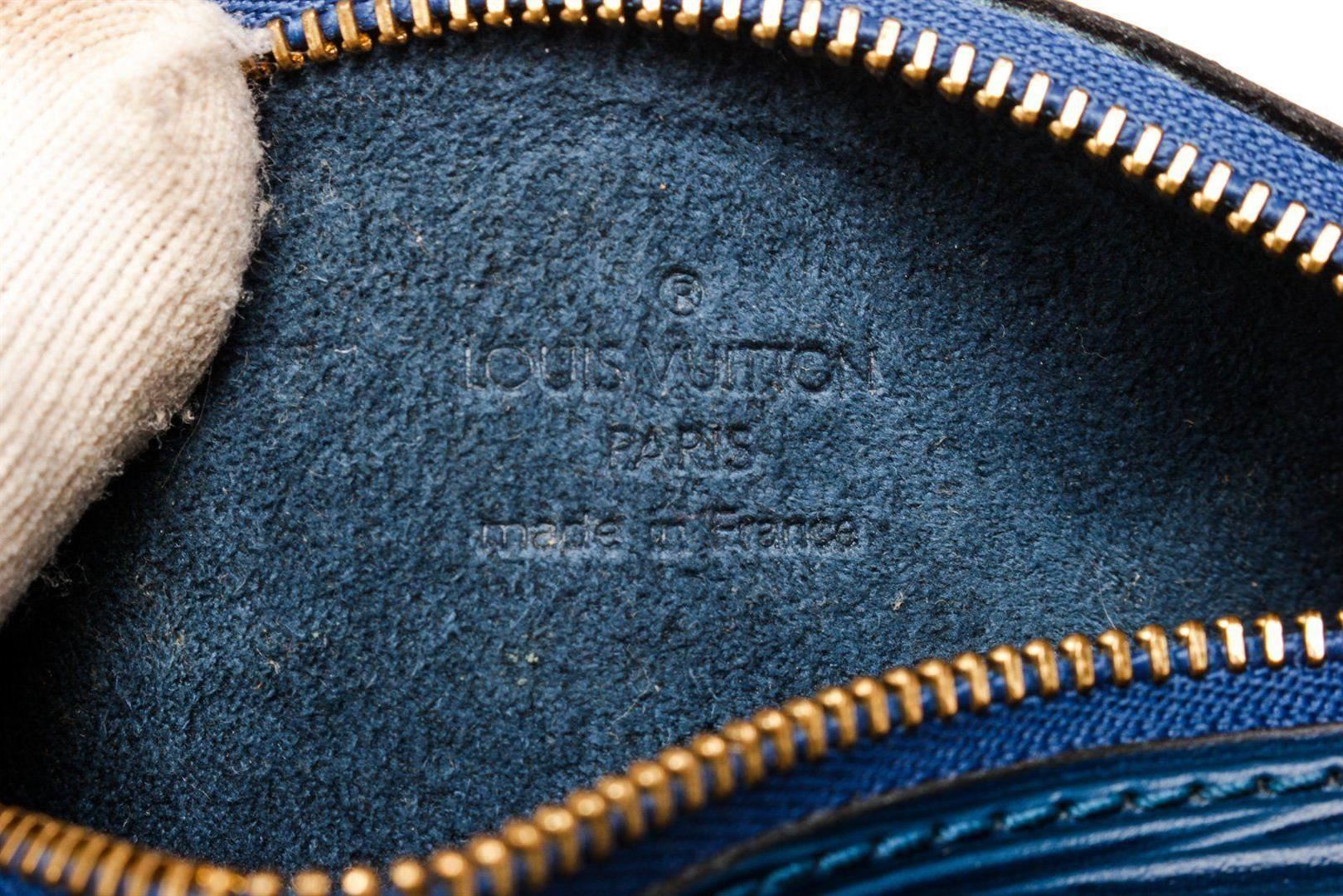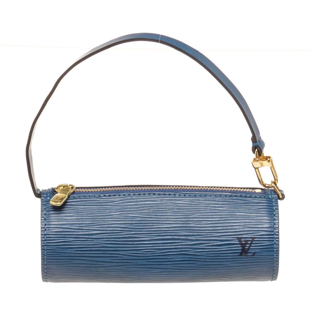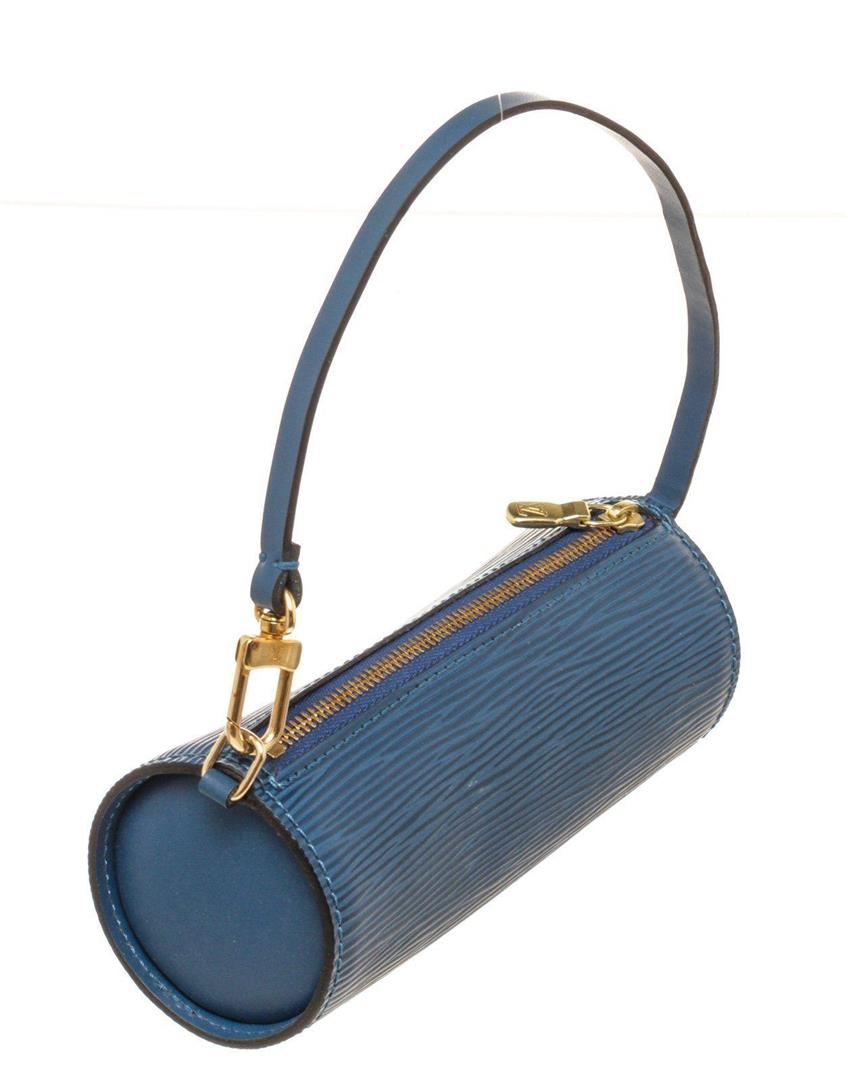 Louis Vuitton Blue Epi Leather Mini Papillon Shoulder Bag with epi leather gold-tone hardware, trim tan vachetta leather and zipper closure.