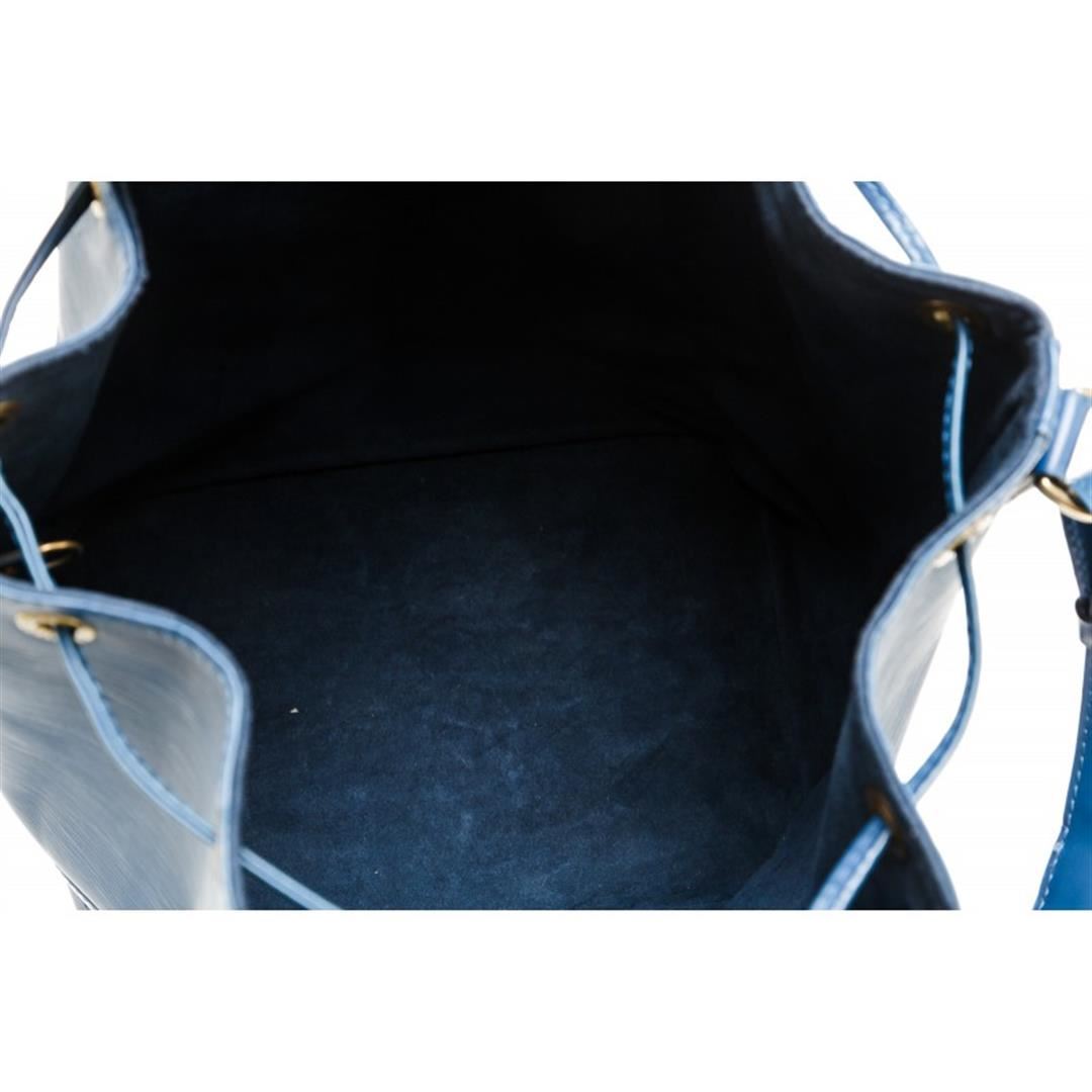 Epi leather Louis Vuitton Noe GM with brass hardware, single adjustable shoulder strap, tonal leather trim, embossed logo at exterior side, Alcantara lining and drawstring closure at top.