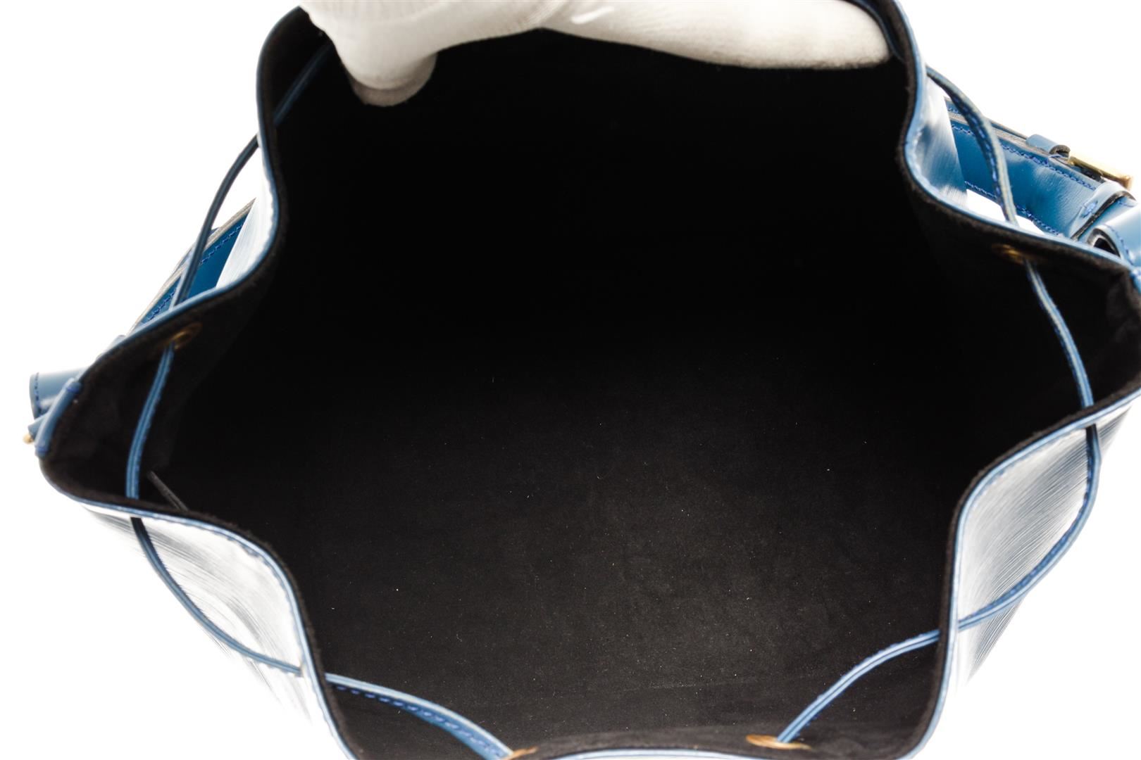 One Louis Vuitton Blue Epi Leather Noe PM. Item is sold AS-IS. All available information is listed in the description and shown in the photo. Louis Vuitton Blue Epi Leather Noe PM with adjustable shoulder strap, suede lining, gold tone hardware and drawstring closure.