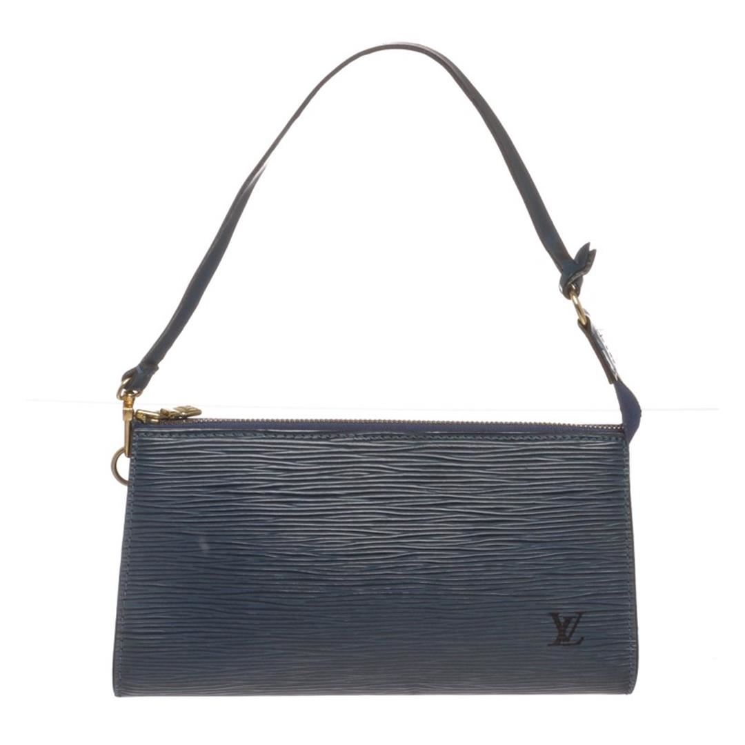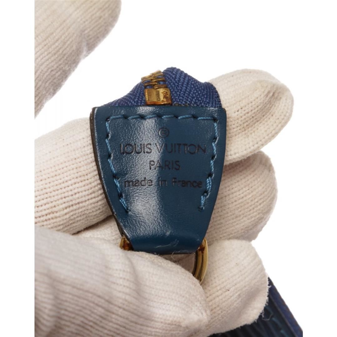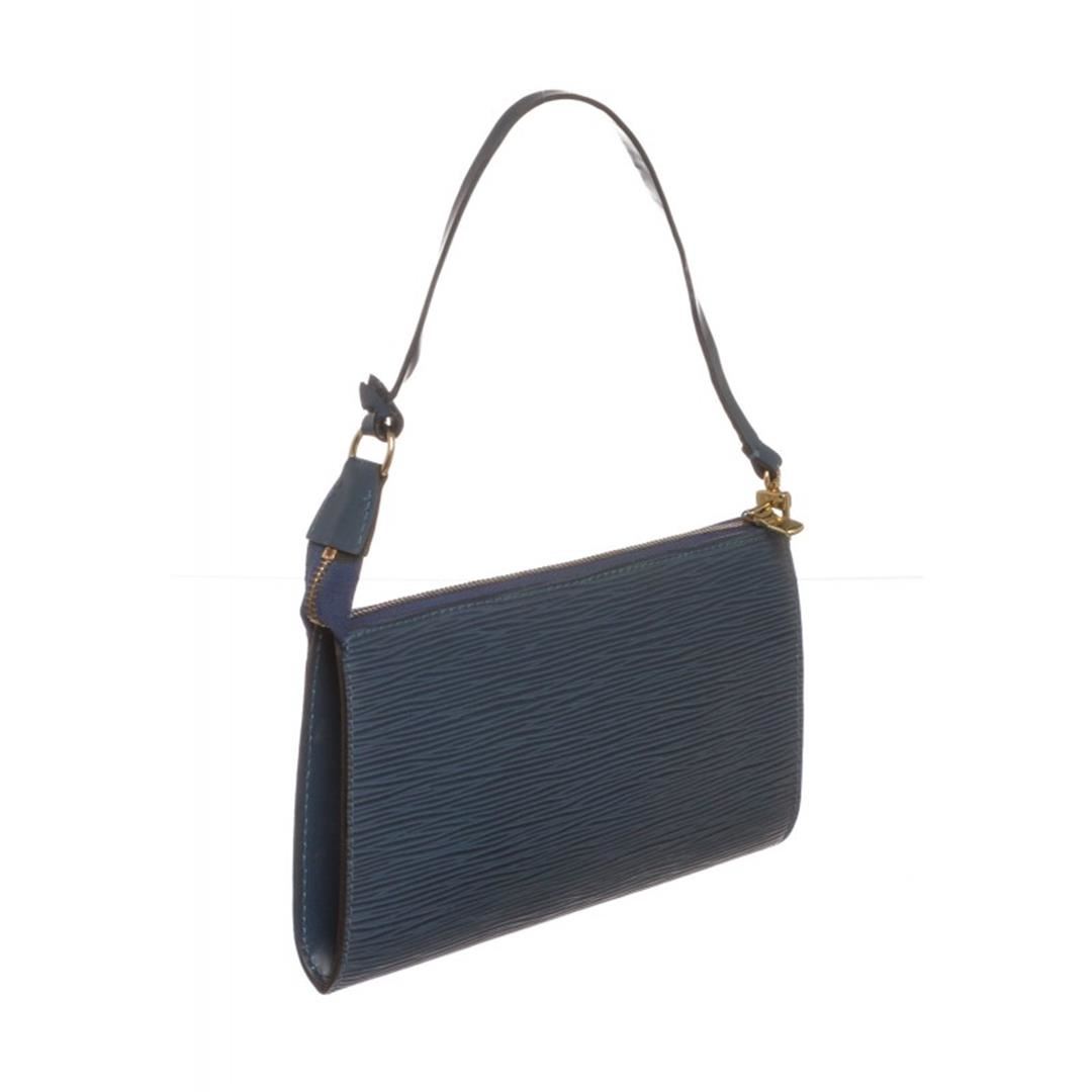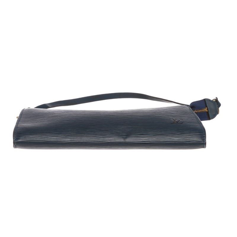 One Louis Vuitton Blue Epi Leather Pochette Shoulder Bag. Epi leather Louis Vuitton Pochette Bag with brass hardware, single flat top handle, Alcantara lining and zip closure at top.