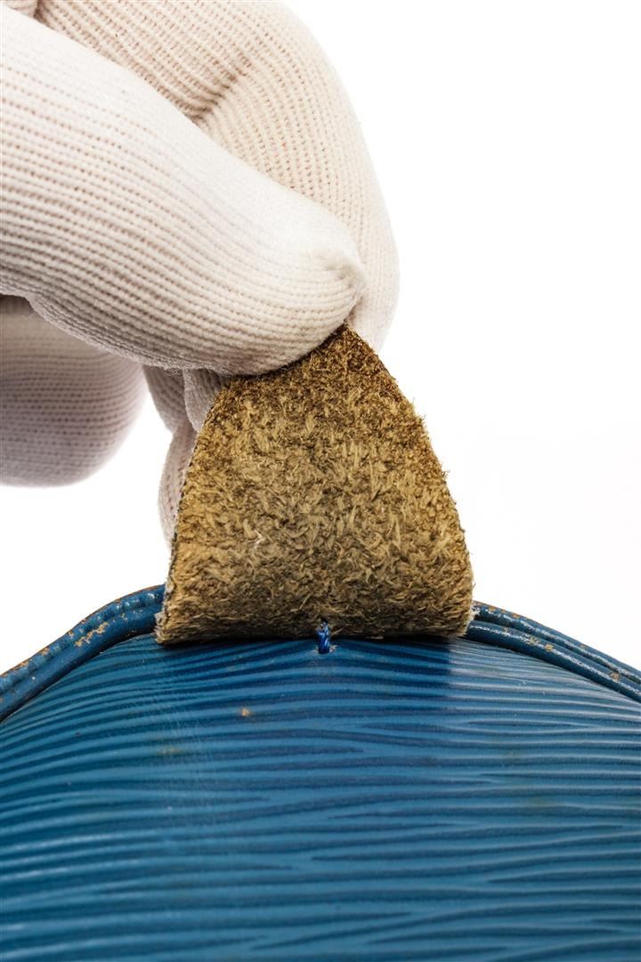 Louis Vuitton Blue Epi Leather Speedy 30 Satchel Bag. All available information is listed in the description and shown in the photos. Louis Vuitton Blue Epi Leather Speedy 30 Satchel Bag with blue epi leather, brass hardware, rolled handles, single exterior pocket, alcantara lining & single interior pocket, zip closure at top. Height: 9.5" Width: 11.5" Depth: 7", Handle Drop: 3.5" / 24.13 x 29.21 x 17.78 cm