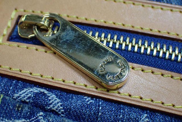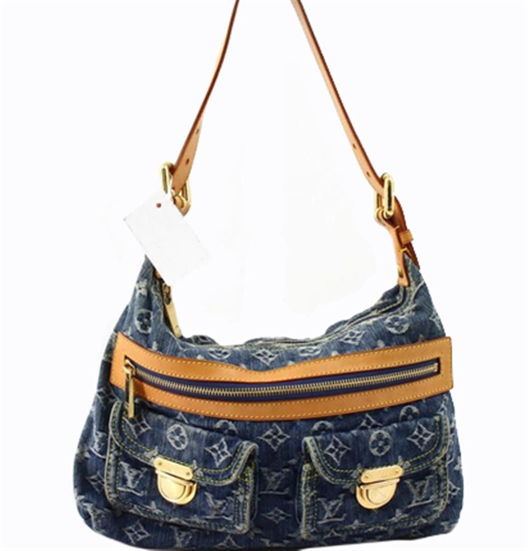 Blue monogram denim Louis Vuitton Baggy GM with gold-tone hardware, tan vachetta leather trim, single flat shoulder strap, three exterior pockets; one with zip closure, marigold Alcantara lining, single slip pocket at interior wall and zip closure at top.