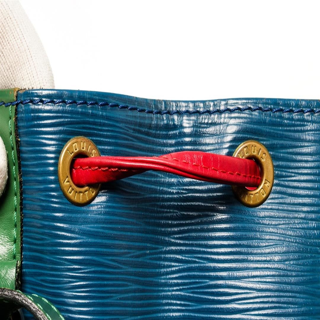 One Louis Vuitton Blue Red And Green Epi Leather Noe Shoulder Bag. Item is sold AS-IS. All available information is listed in the description and shown in the photo. Louis Vuitton red, blue, and green tricolor Noe shoulder bag with epi leather exterior, black leather lining, gold-tone hardware, adjustable strap, drawstring closure, and one main compartment. There are some markings on the leather and some wear on the leather as well. Please refer to photos. Height: 12.5" Width: 13.5" Depth: 7.25", Shoulder Drop: 11.75" / 31.75 x 34.29 x 18.41 Cm