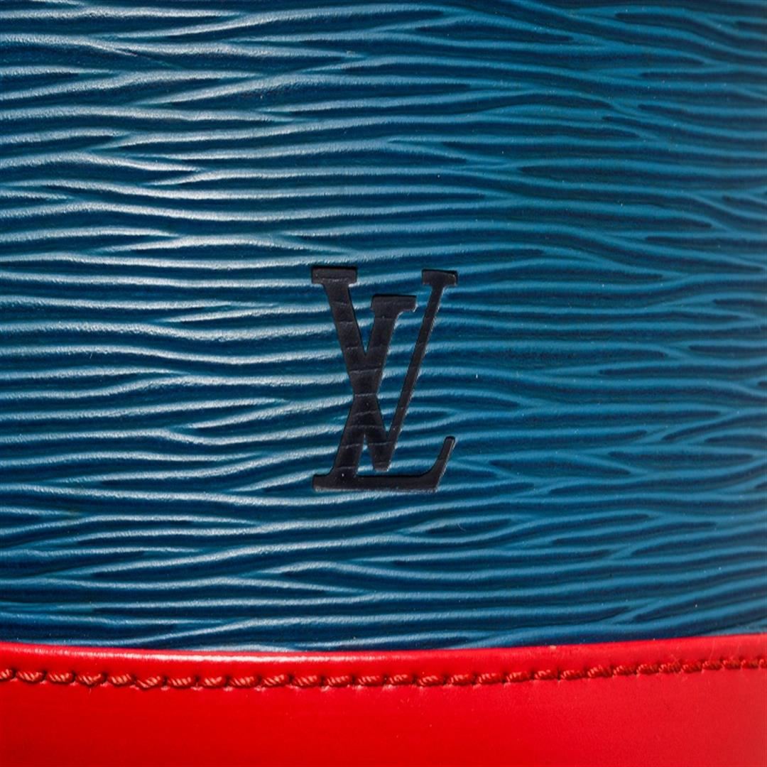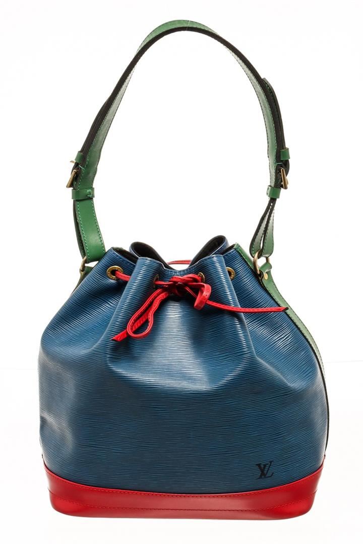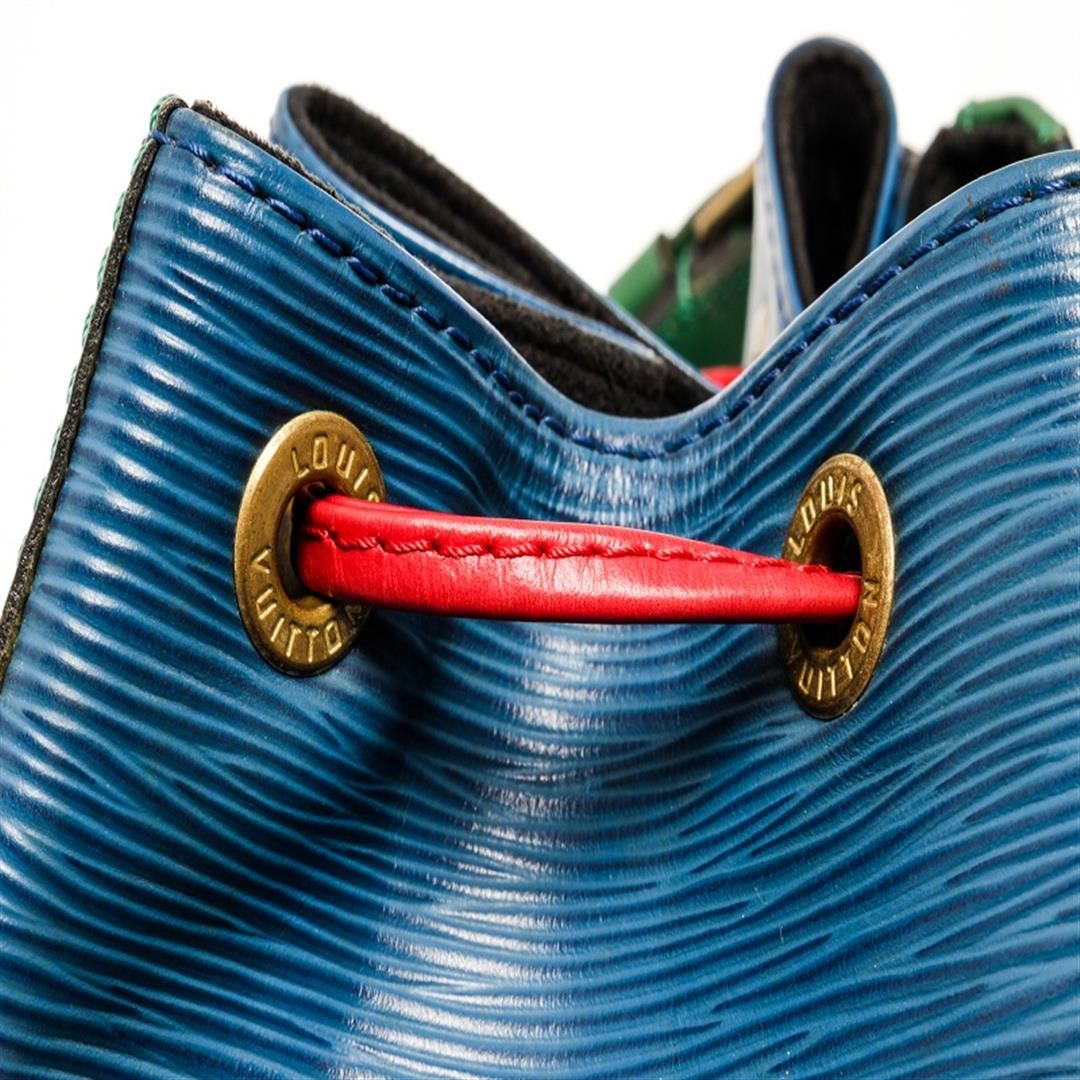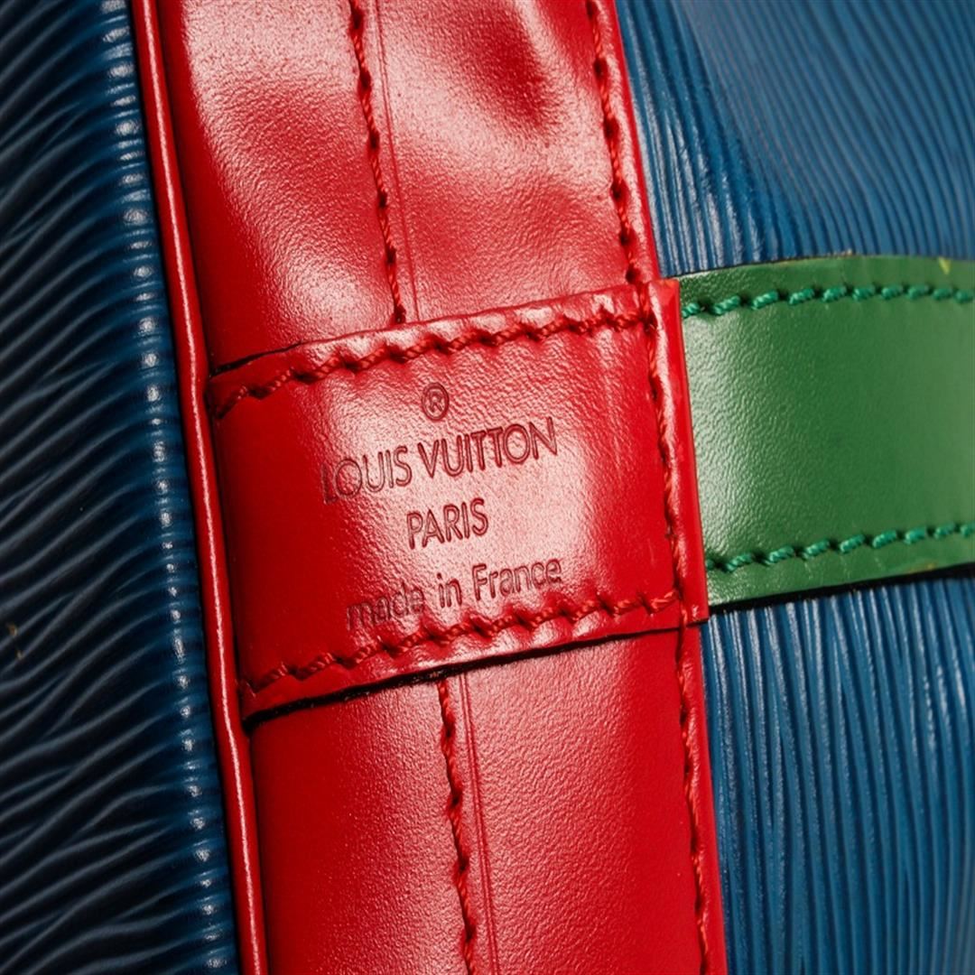 One Louis Vuitton Blue Red And Green Epi Leather Noe Shoulder Bag. Item is sold AS-IS. All available information is listed in the description and shown in the photo. Louis Vuitton red, blue, and green tricolor Noe shoulder bag with epi leather exterior, black leather lining, gold-tone hardware, adjustable strap, drawstring closure, and one main compartment. Height: 12.5" Width: 13.5" Depth: 7.25", Shoulder Drop: 11.75" / 31.75 x 34.29 x 18.41 Cm