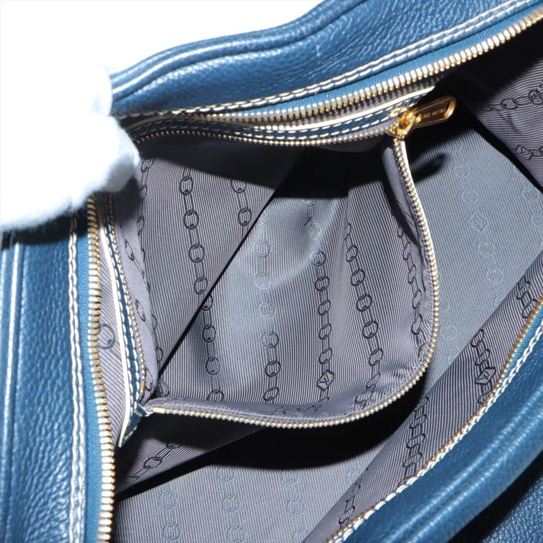 Blue Suhali leather Louis Vuitton Carryall 40cm duffle bag with gold-tone hardware, protective feet at base, zip closure at top, a spacious interior with blue fine textile lining, one zip pocket inside, two exterior side pockets and dual rolled handles.