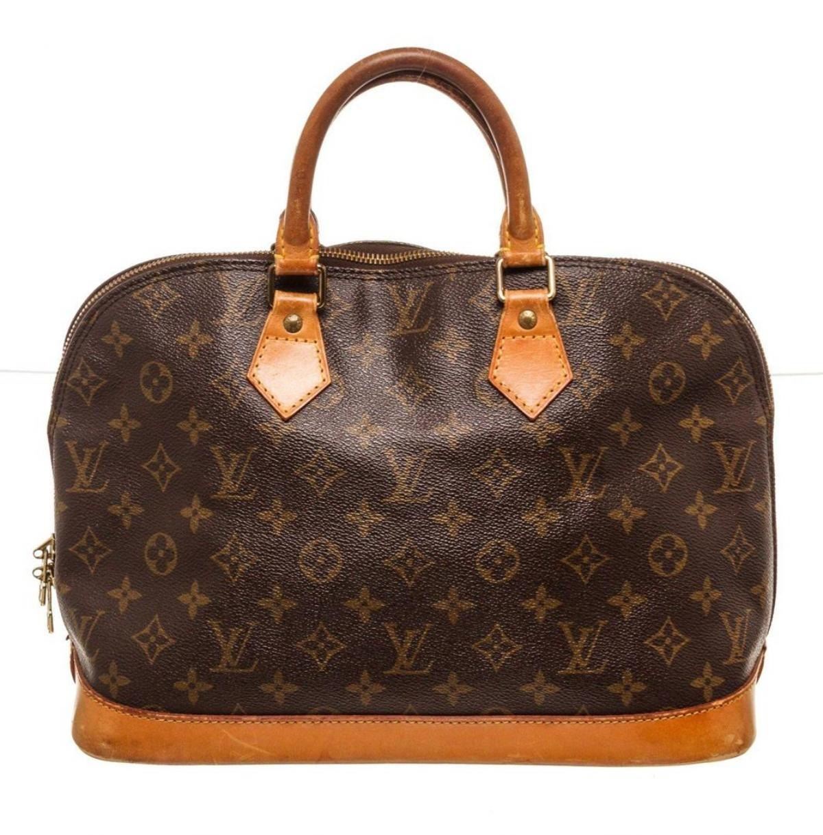 Louis Vuitton Brown Alma MM Satchel Bag. Louis Vuitton Brown Alma MM Satchel Bag with material monogram canvas, gold-tone hardware, trim tan vachetta leather, interior slip pockets, dual top handle and zipper closure.