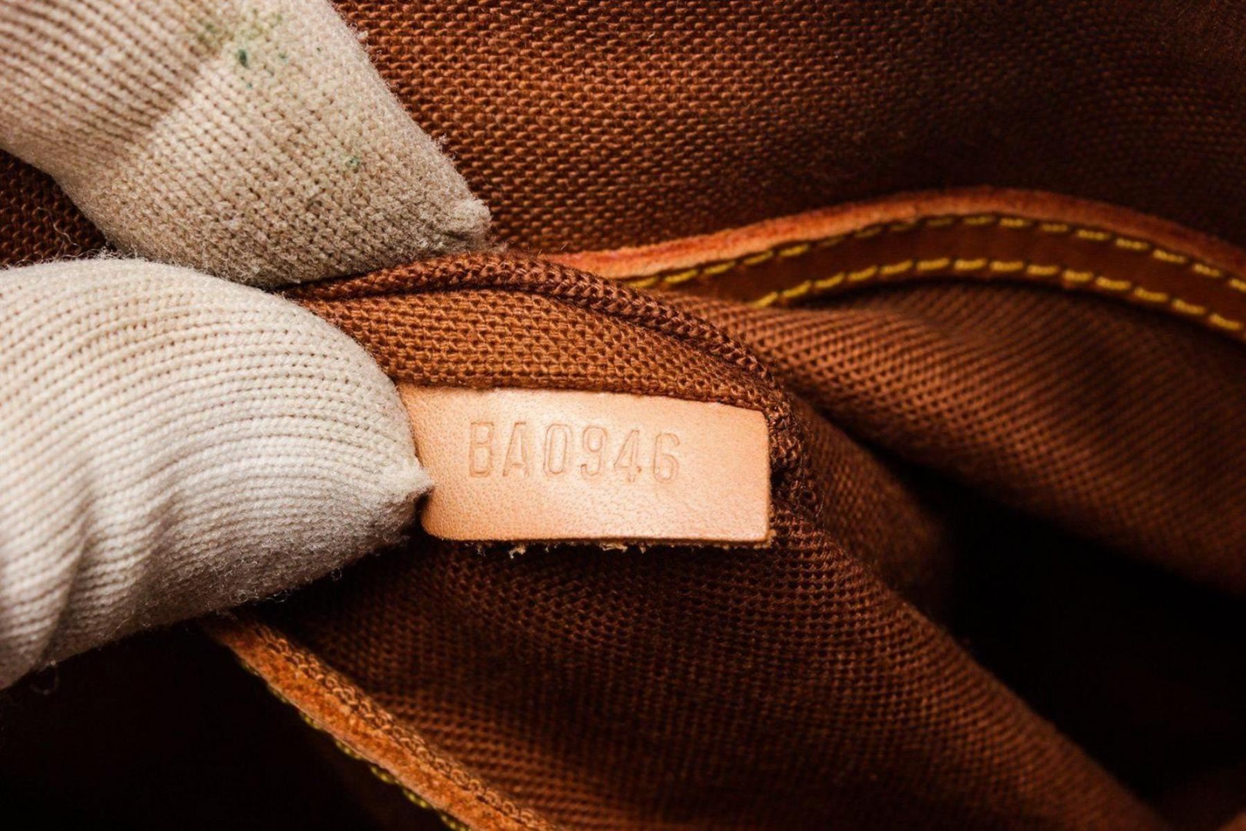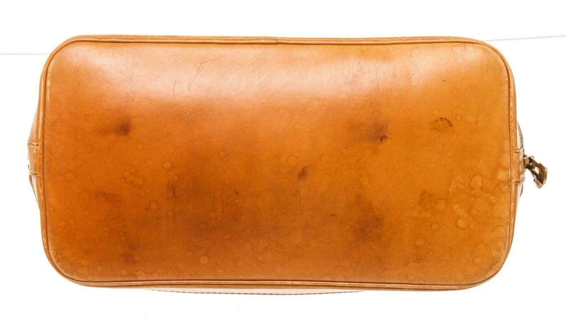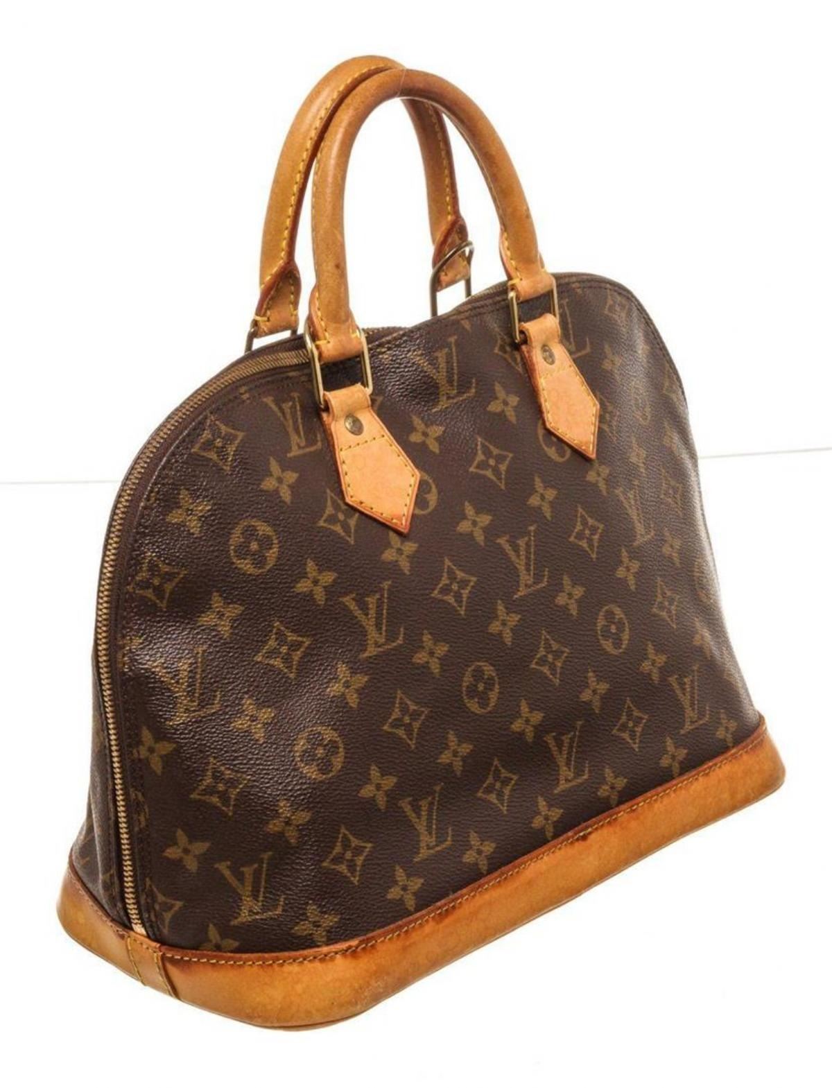 Louis Vuitton Brown Alma MM Satchel Bag with material monogram canvas, gold-tone hardware, trim tan vachetta leather, interior slip pockets, dual top handle and zipper closure.