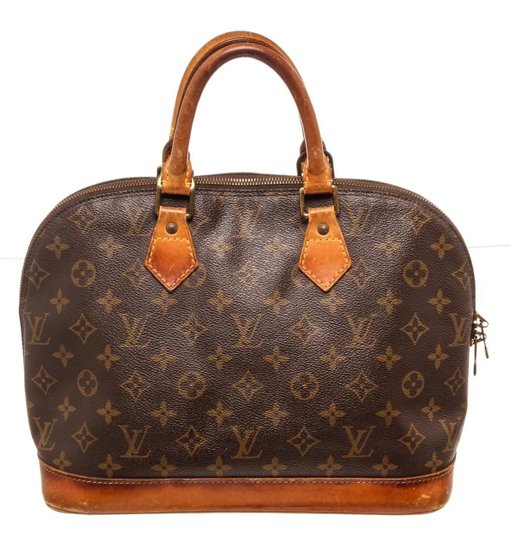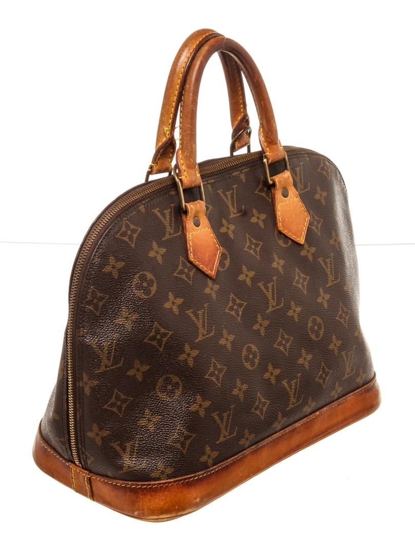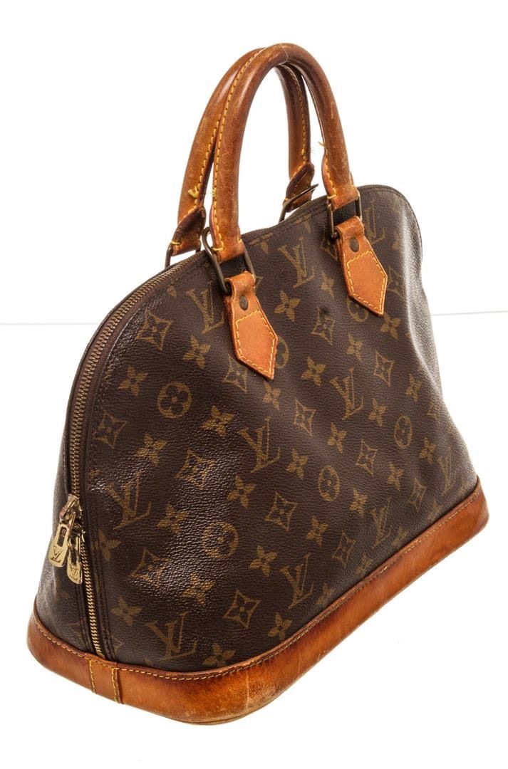 Louis Vuitton Brown Alma MM Satchel Bag with material monogram canvas, gold-tone hardware, trim tan vachetta leather, interior slip pockets, dual top handle and zipper closure.