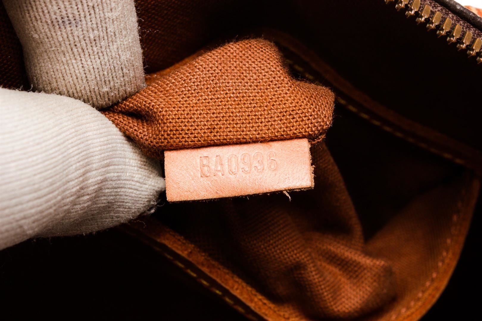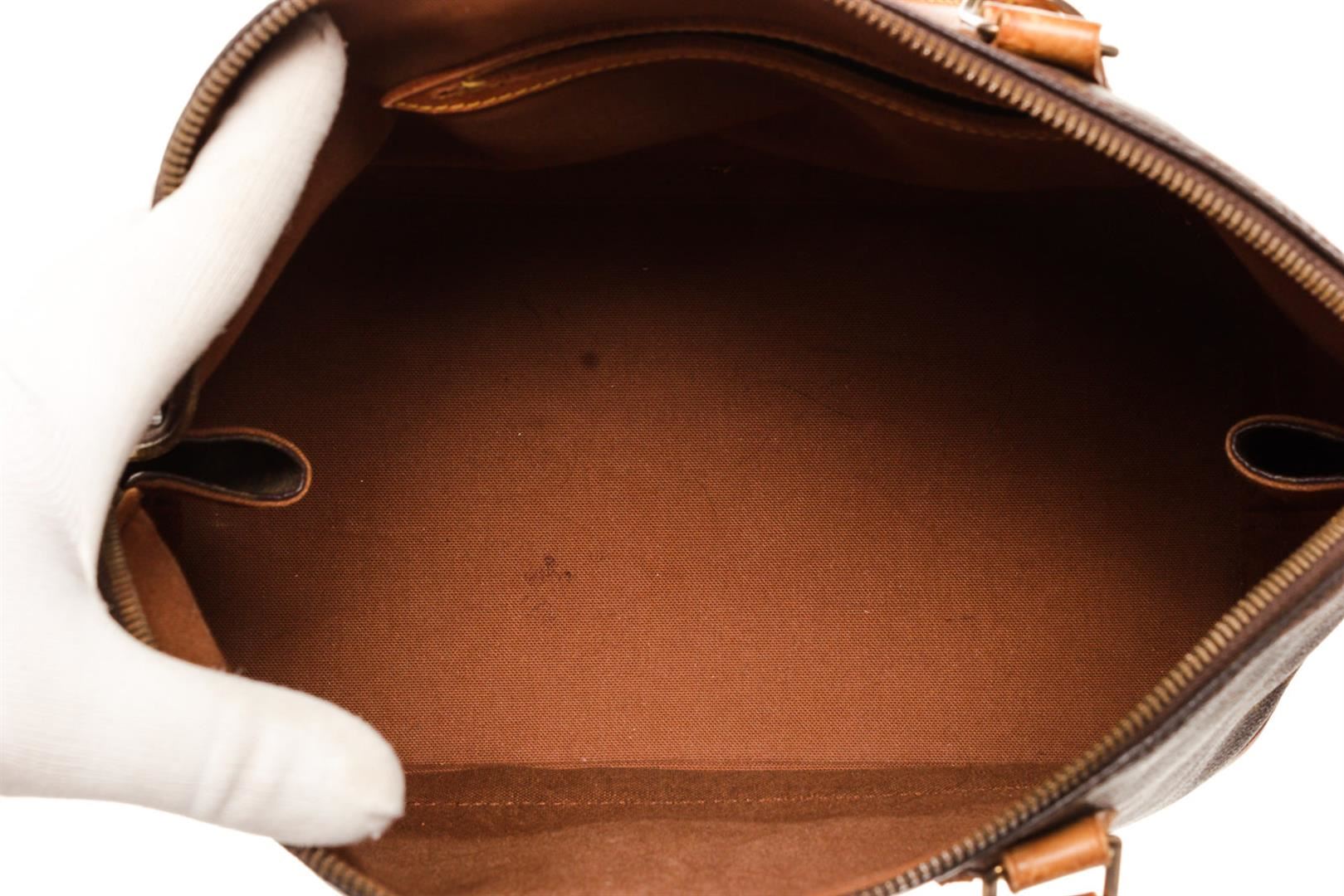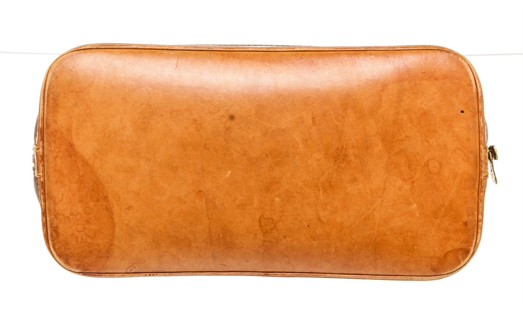 Louis Vuitton Brown Alma MM Satchel Bag with material monogram canvas, gold-tone hardware, trim tan vachetta leather, interior slip pockets, dual top handle and zipper closure.