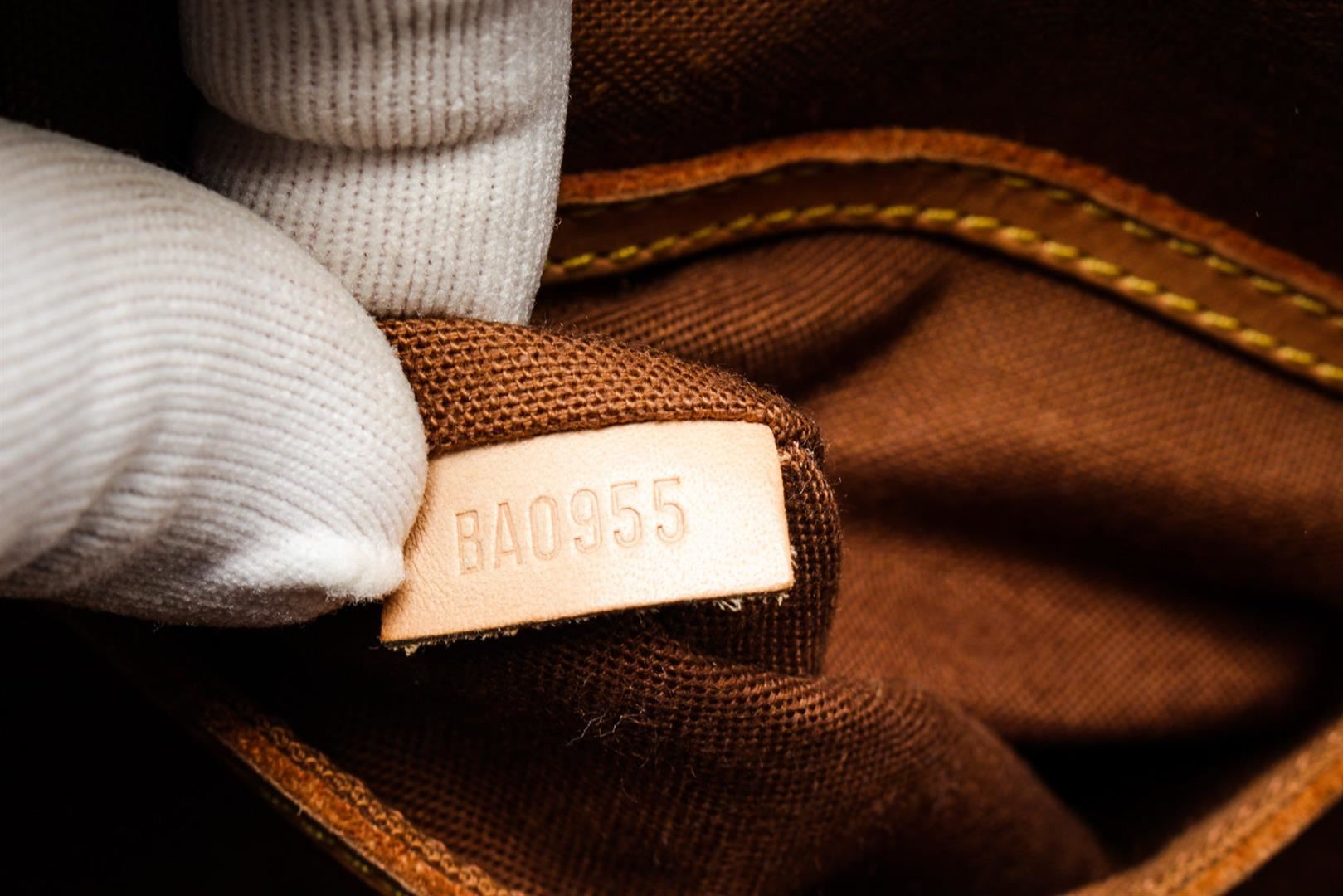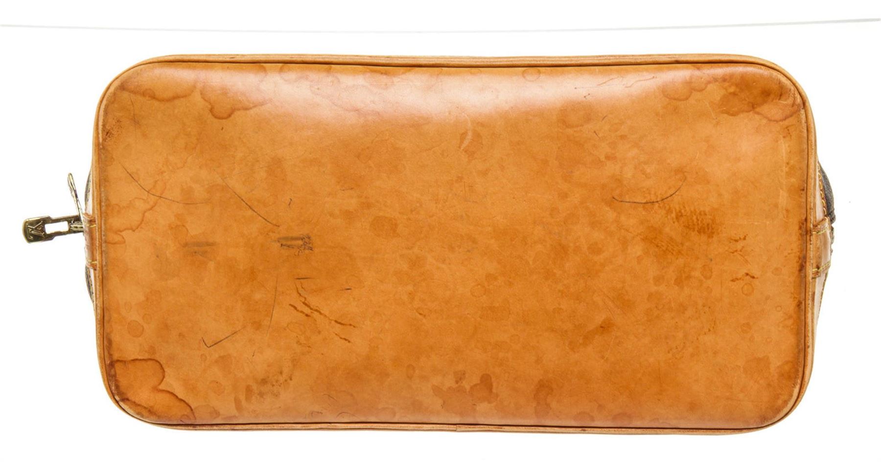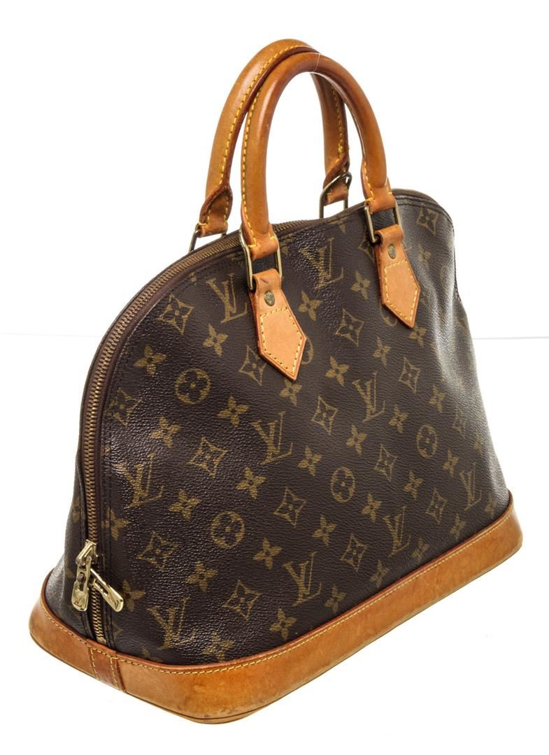Louis Vuitton Brown Alma MM Satchel Bag with monogram canvas, gold-tone hardware, trim tan vachetta leather, interior slip pockets, dual top handle and zipper closure.