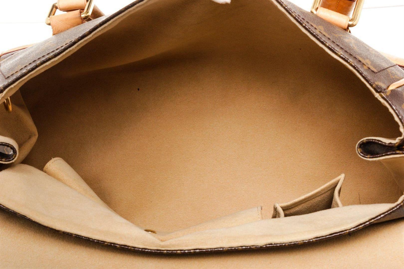 Louis Vuitton Brown Monogram Beverly GM Shoulder Bag with material monogram canvas, gold-tone hardware, tan vachetta leather trim, top handle, leather shoulder strap, and zipper closure.