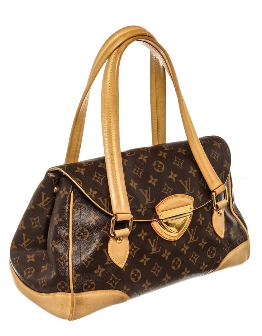One Louis Vuitton Brown Beverly GM Shoulder Bag. Item is sold AS-IS. All available information is listed in the description and shown in the photo. Louis Vuitton Brown Monogram Beverly GM Shoulder Bag with material monogram canvas, gold-tone hardware, tan vachetta leather trim, top handle, leather shoulder strap, and zipper closure.