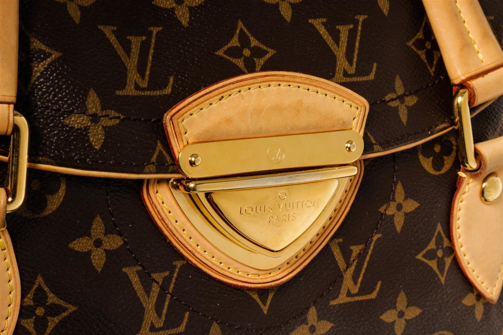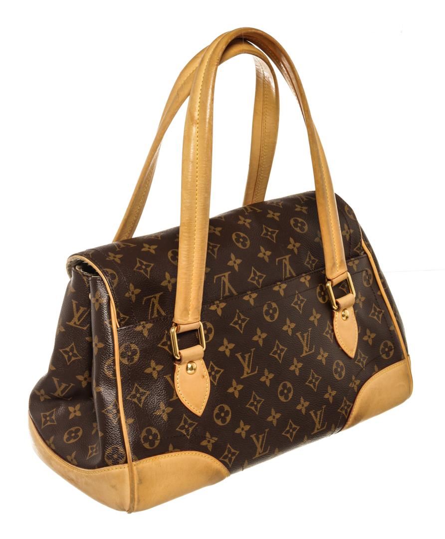 One Louis Vuitton Brown Beverly GM Shoulder Bag. Item is sold AS-IS. All available information is listed in the description and shown in the photo. Louis Vuitton Brown Monogram Beverly GM Shoulder Bag with material monogram canvas, gold-tone hardware, tan vachetta leather trim, top handle, leather shoulder strap, and zipper closure.