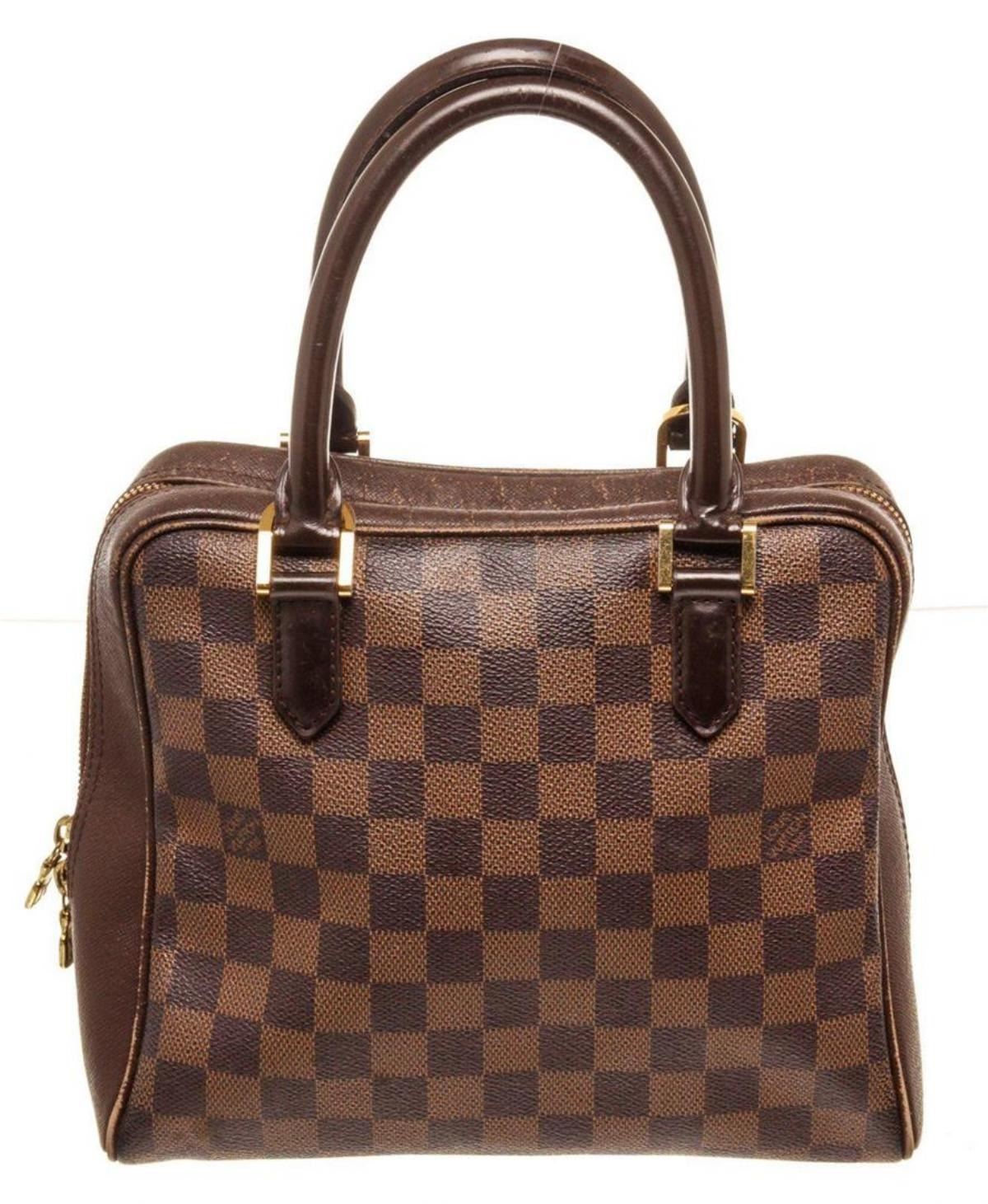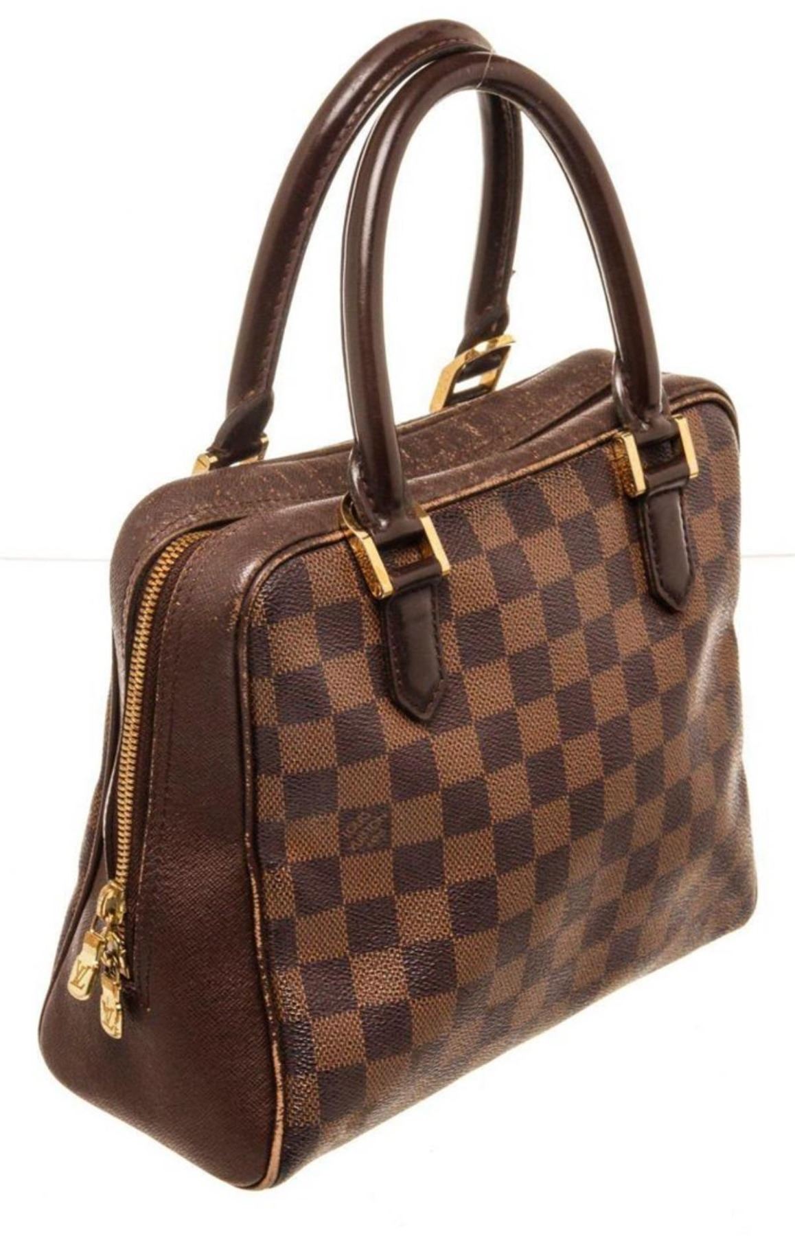 Louis Vuitton Brown Brera Damier Ebene Handbag with damier ebene, gold-tone hardware, trim tan vachetta leather, interior slip pockets, top handle and zipper closure.